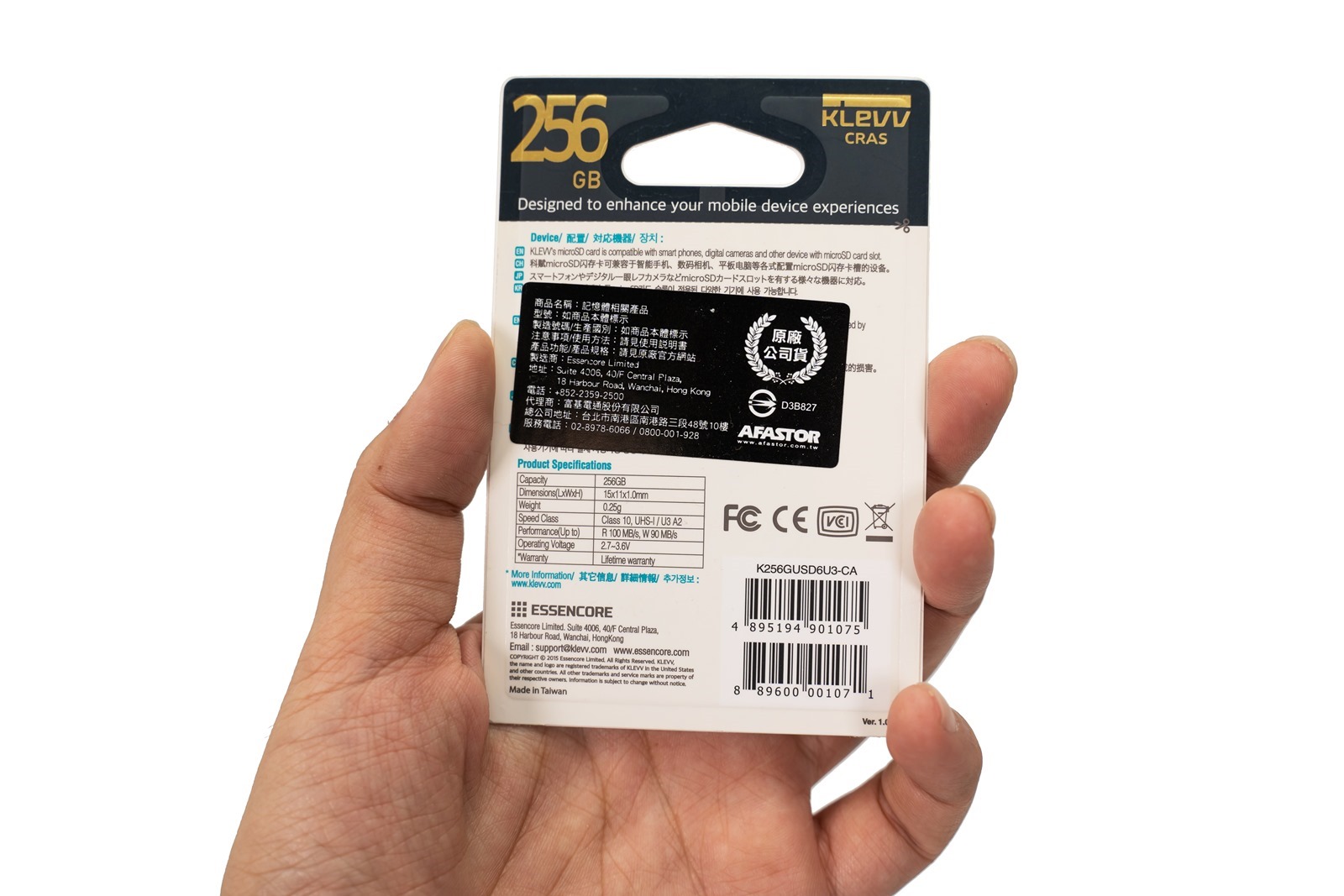 阿輝是在 Pchome 線上購入的台灣公司貨版本,比較重要的首先就是終身保固也是一定要的!這張記憶卡採用的是韓國大廠 Hynix 晶片,256GB 版本官方標示的卡片速度是 Class 10 / A2 / UHS-1 (U3) 規格,在 PChome 購物產品介紹與產品包裝上標示的規格為讀取最高 100MB/s,寫入 90MB/s(包裝上則沒有標示)