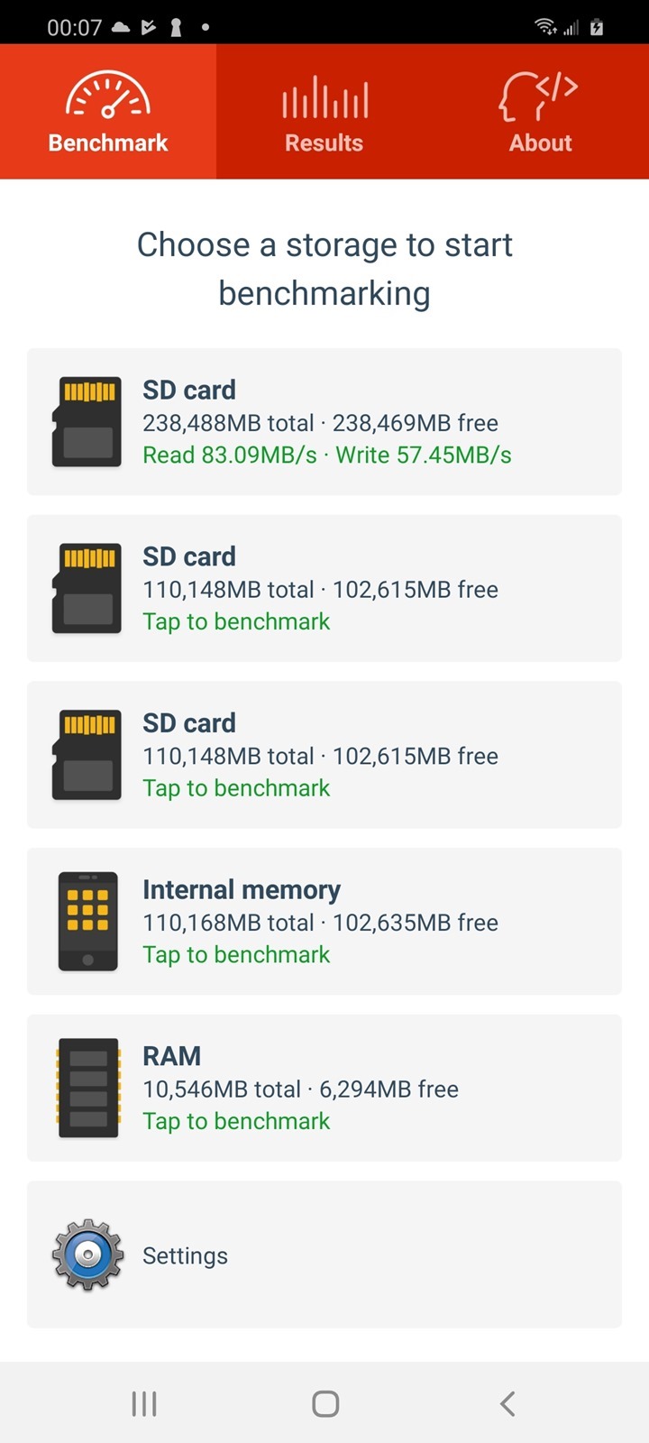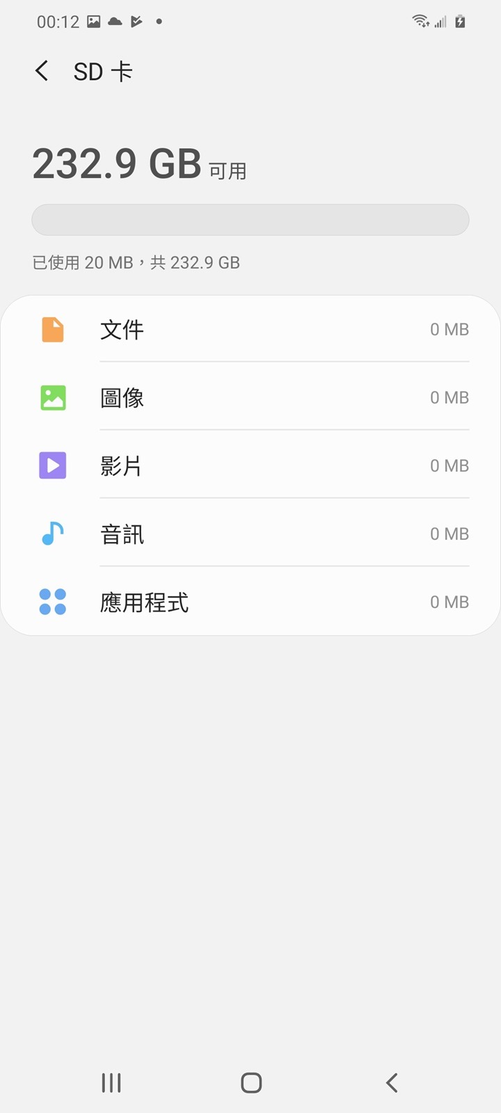 手機方面阿輝使用 Galaxy S20+ 上實際使用 A1 SD 測速軟體,成績讀取約 83 MB/sec,寫入約 57 MB/sec;可用空間約為 232.9GB 容量。
