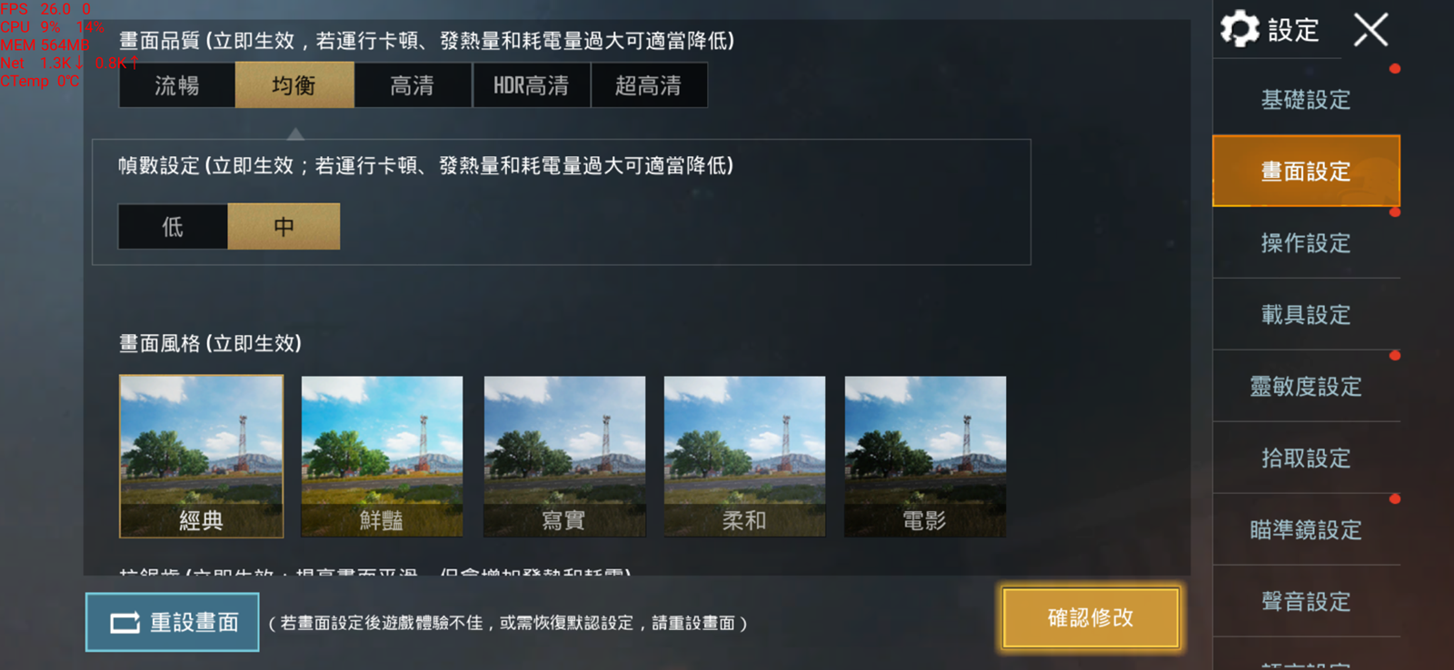 比較可惜可能是因為考慮到順暢度的優先,PUGB 在 Desire 20 Pro 上最高僅可以開啟均衡與中幀數,這時遊戲限制的情況下滿幀數就是 30fps 。