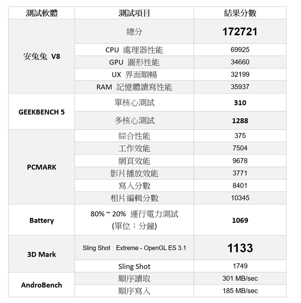阿輝實際測試 Desire 20 Pro 內建電池容量為 5000 mAh,實測電力部分以 PCMARK 做標準測試,測試 80% ~ 20% 間的電力運行,模擬上網、工作、遊戲的混合應用,測試結果為 17 小時 49 分鐘,測試方式與標準可以參考這篇說明。