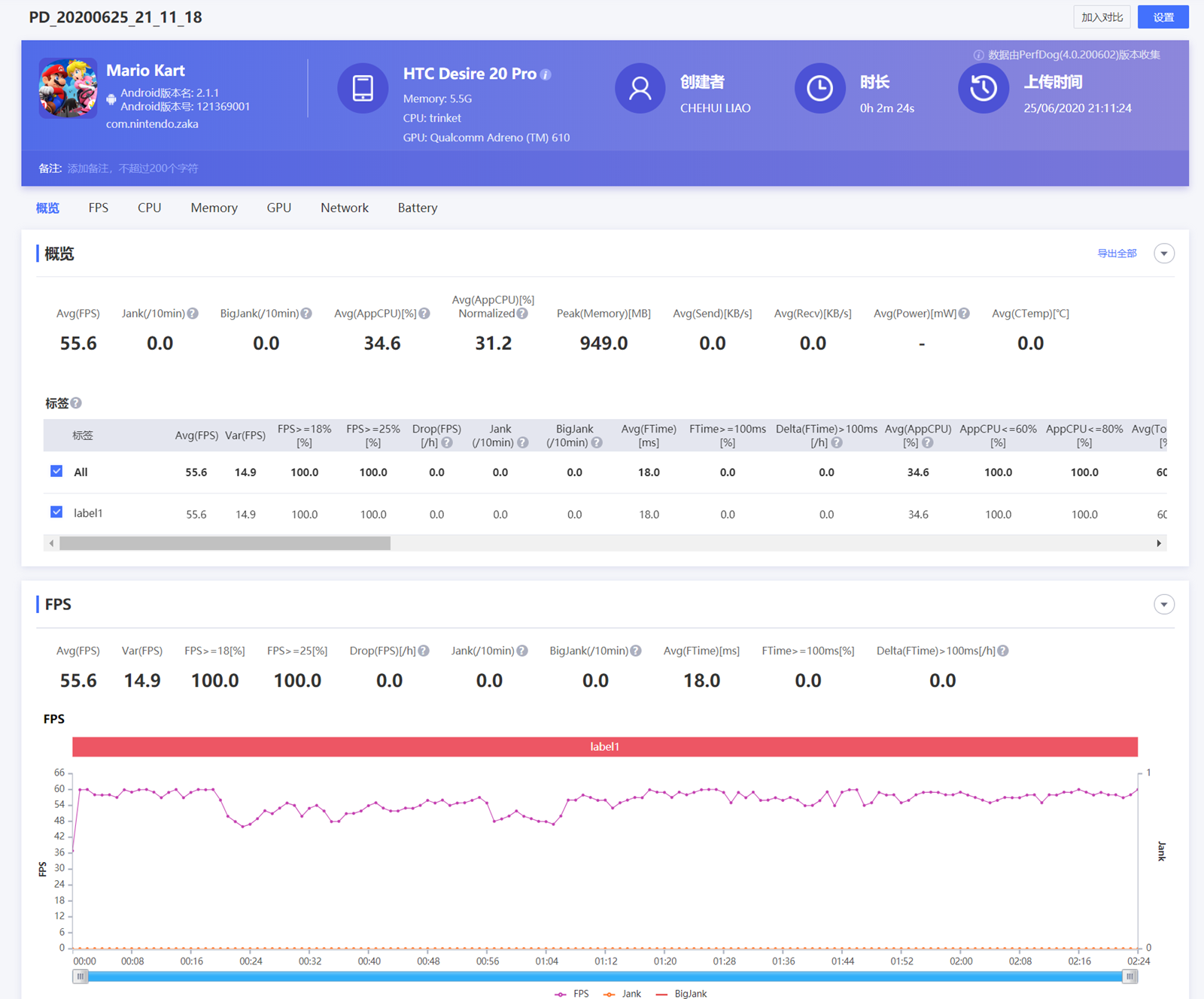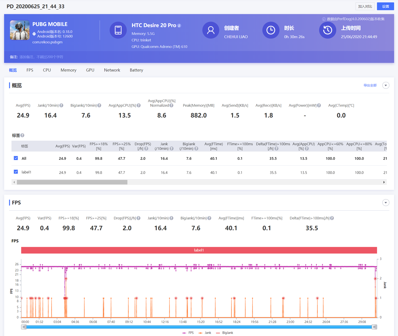 在一局遊戲約 20 分鐘左右,運行平均張數為 24.9 Fps,看記錄線圖張述非常穩定,不過不算高