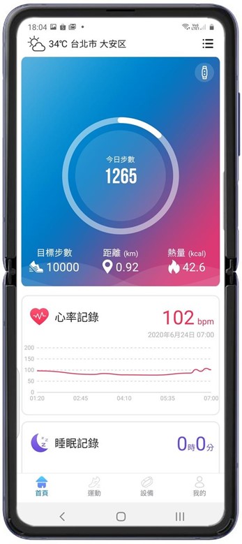 Haylou Fit 應用首頁主要顯示最重要的每天走路步數、心率紀錄還有睡眠紀錄資料