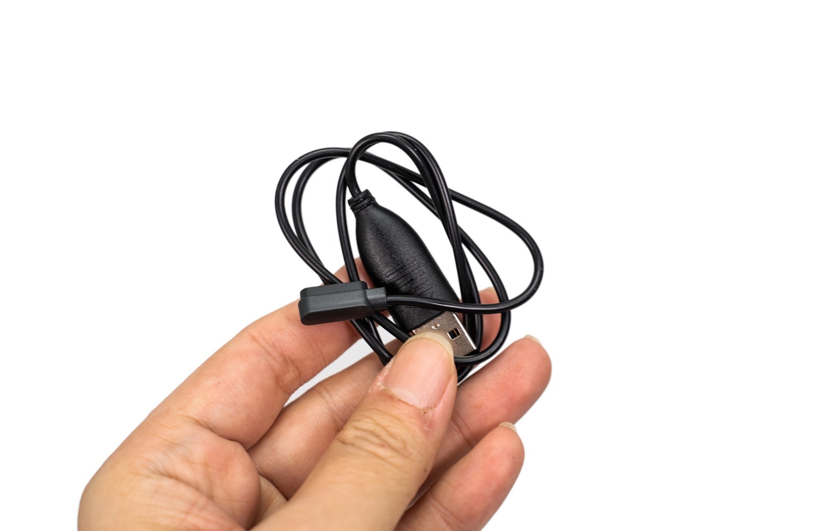 下方有兩個金屬接點可以以磁吸方式連接充電線材。