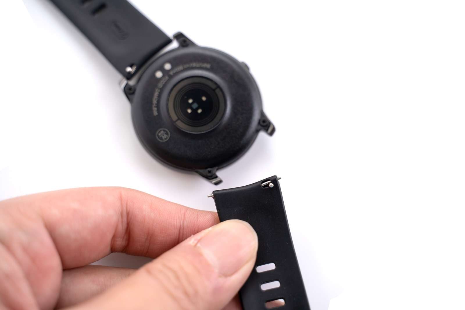 Haylou Solar 智慧手錶 錶帶採用標準 22mm 寬度可以更換的錶帶,標準內附的錶帶採用快拆的設計不使用任何工具的情況下就可以輕鬆更換錶帶,Haylou Solar 智慧手錶內付的橡膠錶帶算是比較基本款,舒適不怕水,不過要注意 Haylou Solar 的錶帶固定結構是有弧形的設計,若想自行更換錶帶,一般市面上單純非曲線邊緣的 22mm 錶帶會無法安裝,若是要選擇非原廠錶帶需要注意相容性問題。