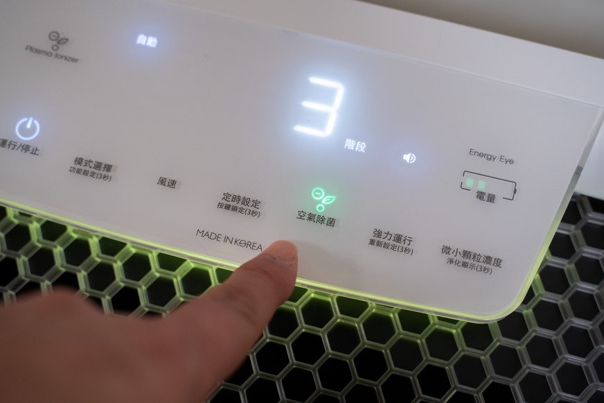 福庫空氣清淨機不止提供了以上介紹的四層漸近式濾網,能夠達到基本淨化空氣、過濾有害物質的功能之外,還具有電漿除菌的功能,開啟操作面板上的『空氣除菌』後就可以開始讓清淨機做除菌的工作,除了可見、不可見的空氣細小微粒之外,看不見的細菌也能透過福庫空氣清淨機被消滅後再送出淨化後的空氣在家中循環,使用的時候機體如果發出類似吱吱的聲響也是正常的唷,那就是機器在做電漿除菌時的作動聲音。