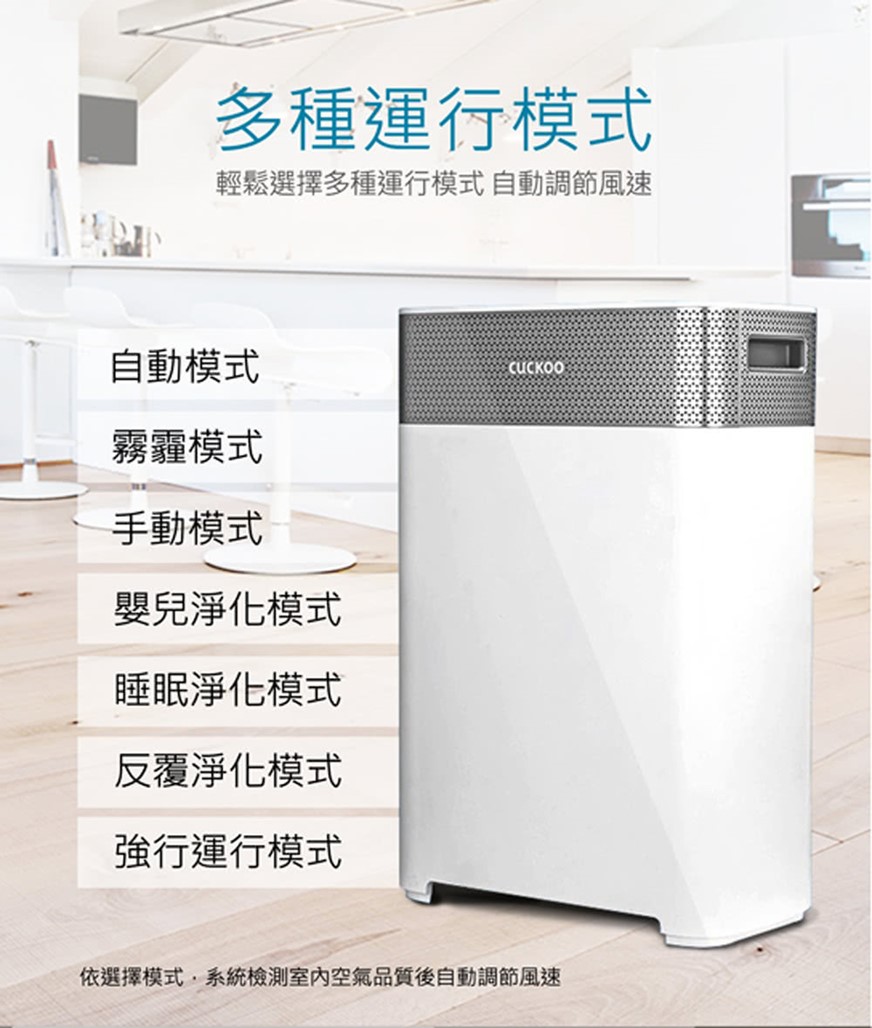 Cuckoo 福庫空氣清淨機提供了多種運型模式,可以自動調節風速和依使用情境做設定轉換,分別有:自動模式、霧霾模式、手動模式、嬰兒淨化模式、反覆淨化模式、強行運行模式。可做切換。