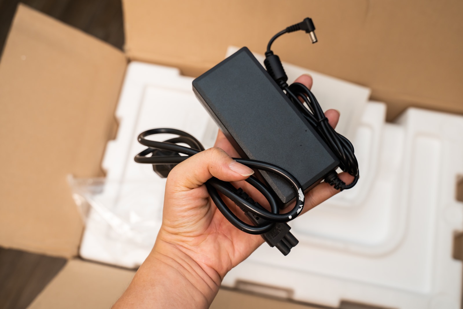 盒裝的內容物也相當單純,除了機體本身用保麗龍固定的相當穩固之外,還有一本說明書與一條 AC 電源供應器和電源線。