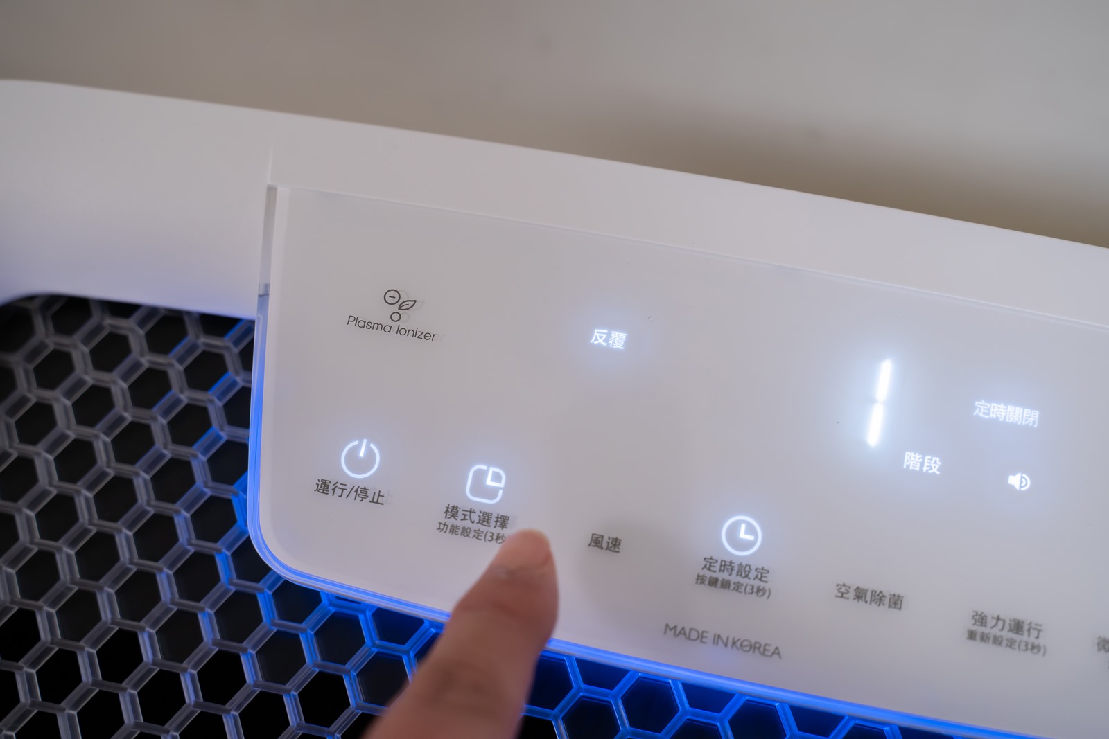 使用面板上的『模式選擇』鍵可以作不同模式的切換,當前使用模式的燈號則是以白色的字樣顯示在操作面版的左側部份。開啟語音功能的話,也能聽到機器通知當前選擇模式,語言的部份共有中、英、韓可做選擇。