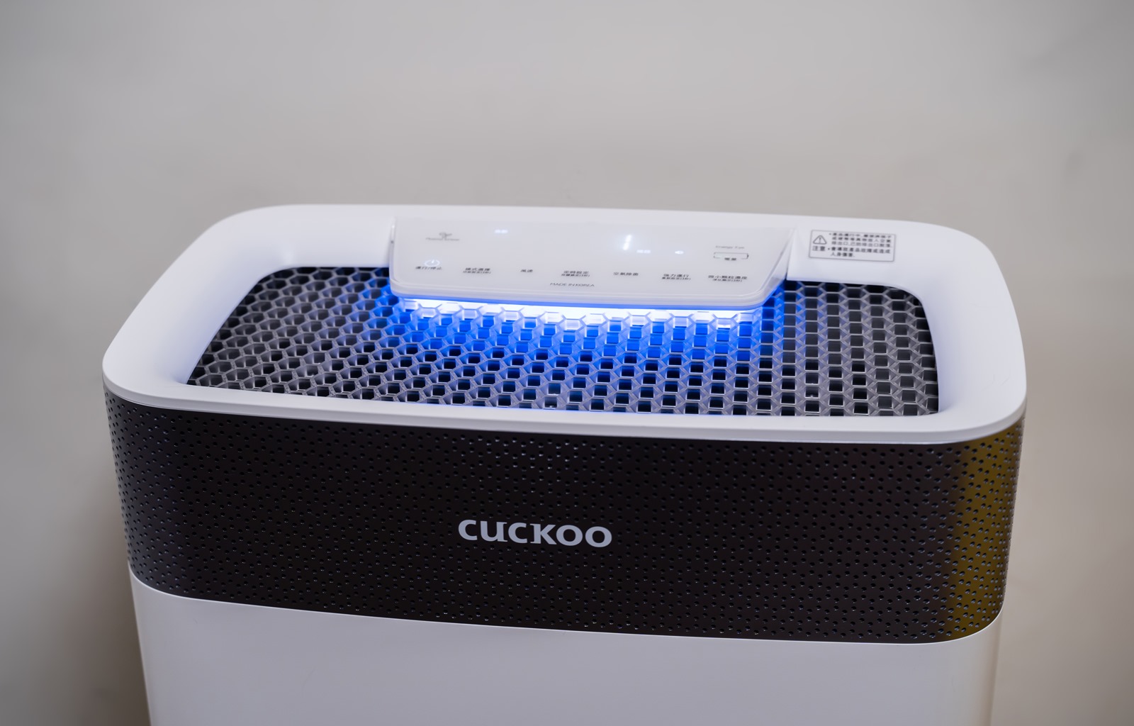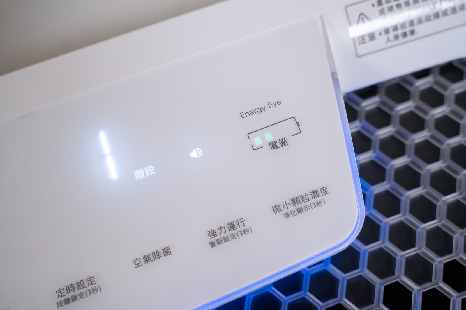 機身上蓋的部份是操作面板與蜂巢狀造型的空氣排出口,就好像福庫是一台為了空氣品質努力工作的小蜜蜂一樣可愛又勤勞。