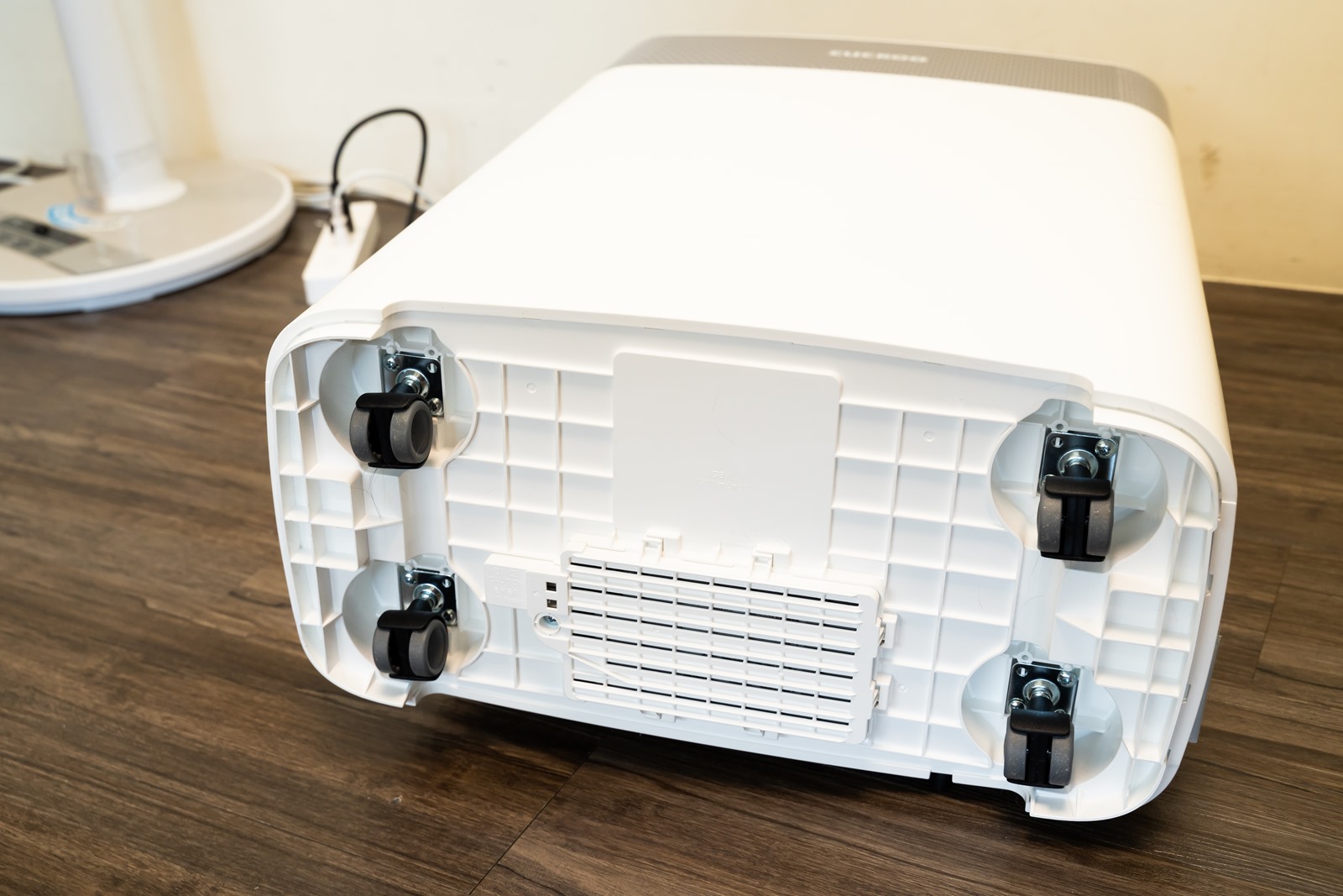 機身的底部設計有四顆滑輪設計,可隨意移動到家中各個空間角落做使用,這點一般都是比較常在除濕機的設計上會看到的設計,在福庫空氣清淨機上卻也注意到了這部份的貼心;而且輪子也完美的像高級行李箱一樣的設計是藏在機身內部,視覺效果上又再更加分。