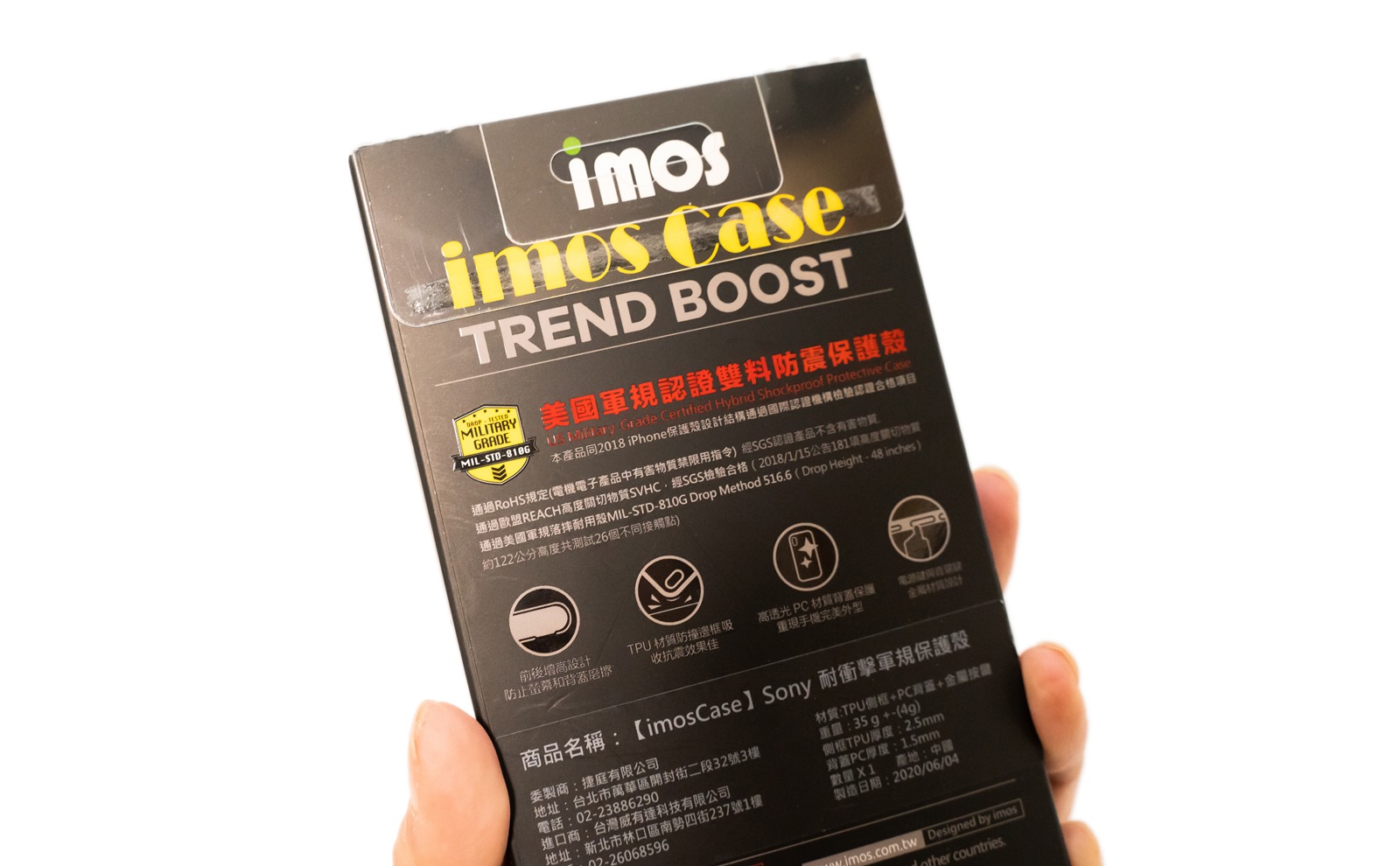 imosCase 軍規雙料防震保護殼系列,通過軍規 MIL-STD-810G Drop method 516.6 (高度 122 公分的 26 個不同角度落摔測試) ,3 秒易拆裝的特性,相容所有 imos 自家全部滿版保護貼