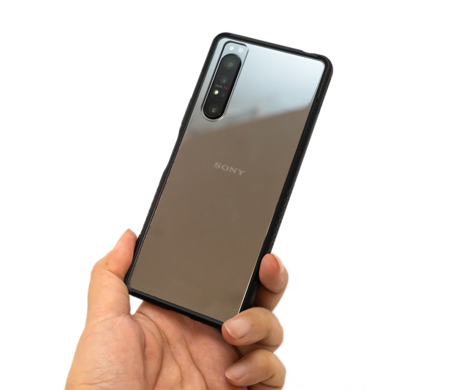 雖然有著軍規防震等級,但一手掌握的親手性很舒服,裝上手機後背面依然可以嗅出高調的 SONY 標誌,還保有清透的鏡面高透光