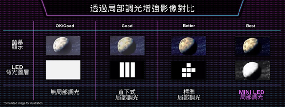 ↑Mini LED 面板具備超高亮度、廣色域等優勢