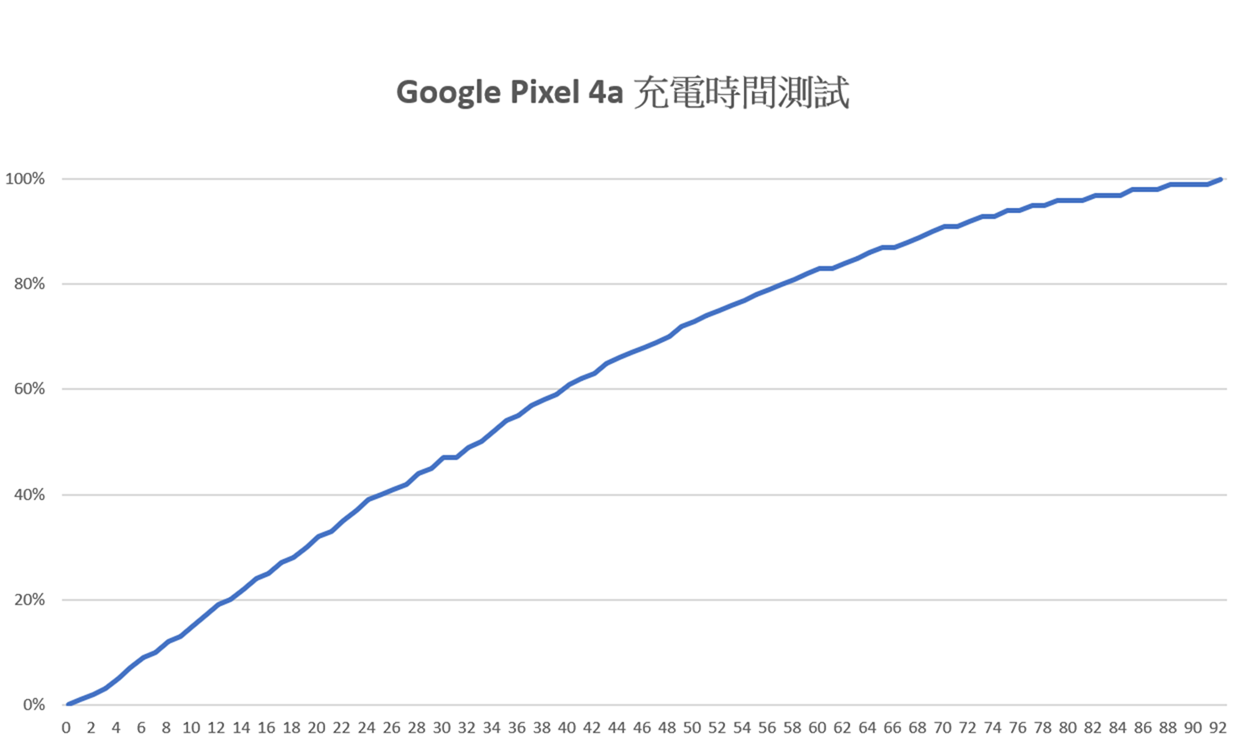 Pixel 4a 支援 PD 快充並直接內付了 18W 充電器,這裡阿輝也實際測試從 0% 充電到 100% 的充電紀錄並繪製曲線給大家參考。內建 3140mAh 大容量電池的 Pixel 4a,半小時充電約 47%,約 1 小時 32 分充滿到 100% 。