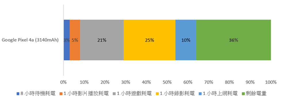 - Pixel 4a 相機連續錄影測試 1 小時,實測消耗 25% 電量,剩餘 46% 電量