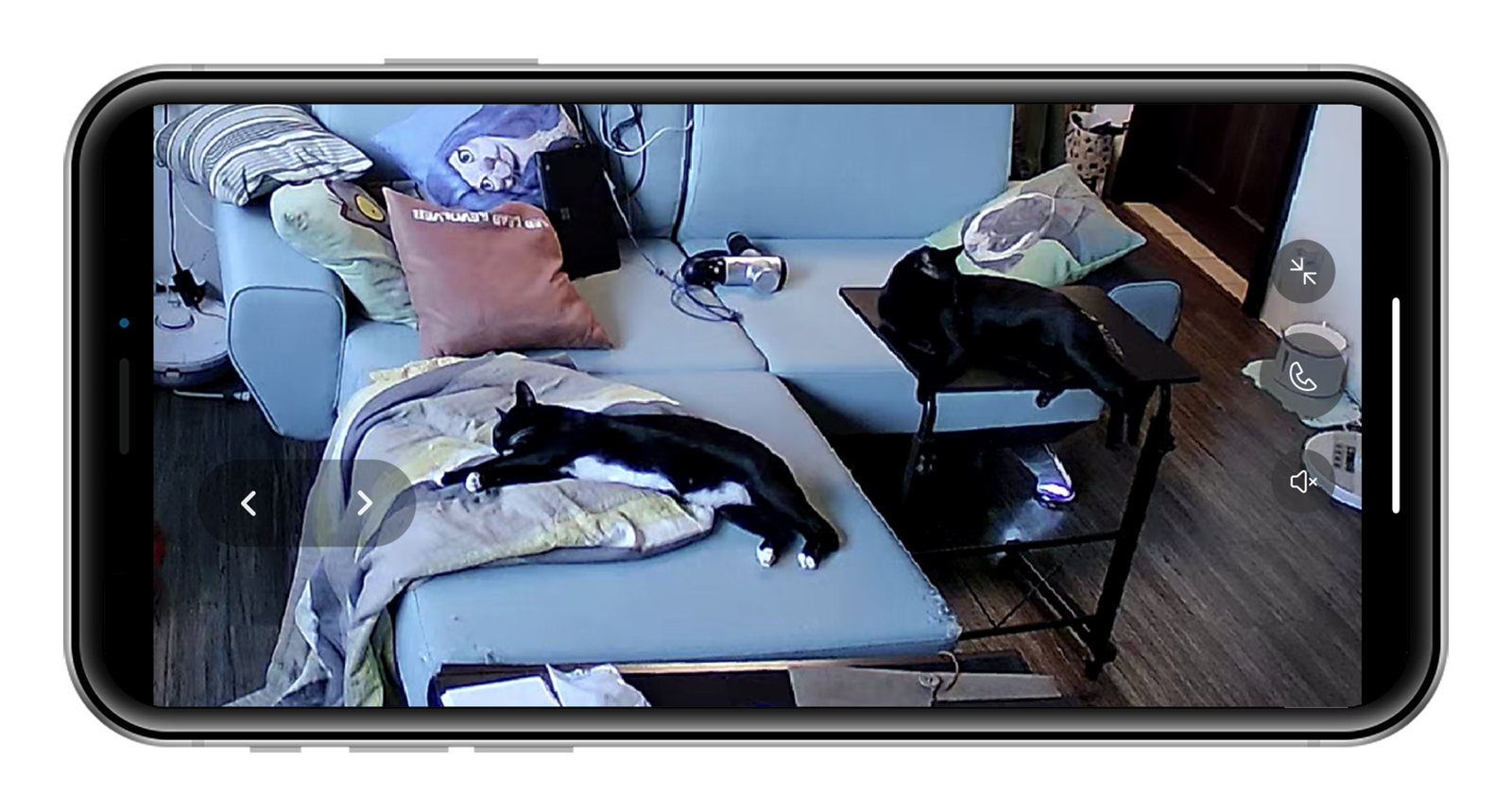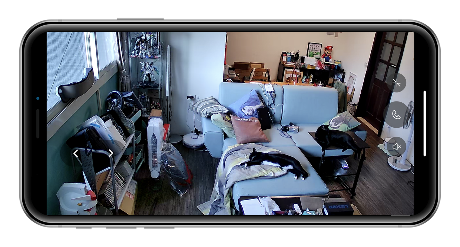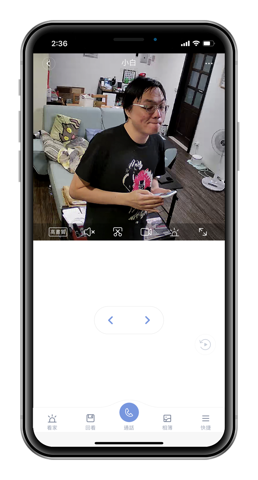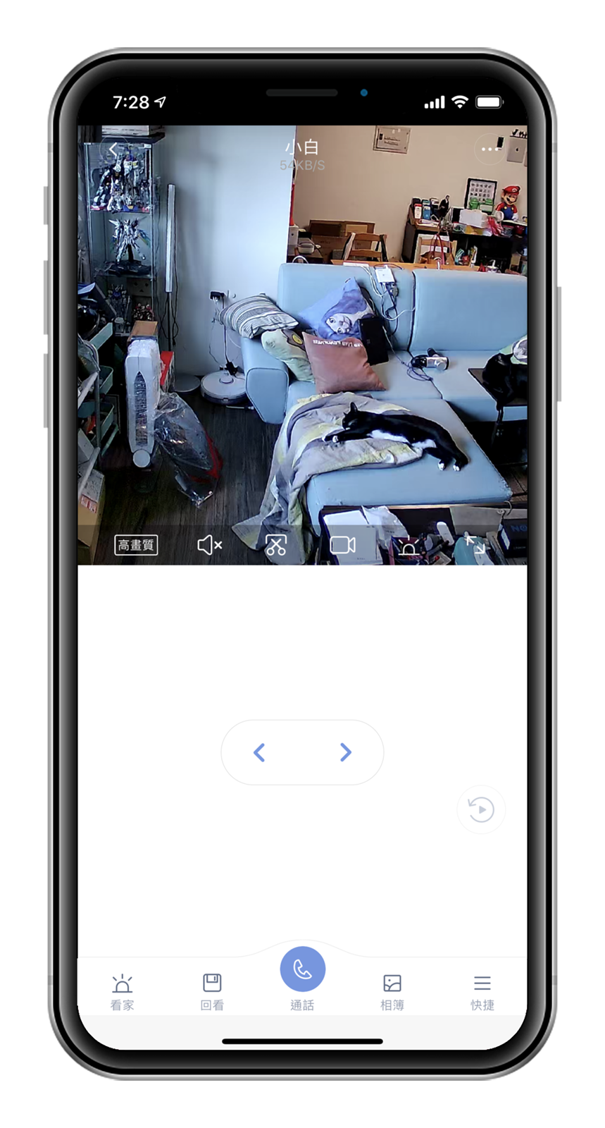 也可以即時監看目前我家的貓到底在做甚麼事情,覺得太無聊,按下右方的通話按鈕,聲音就會從小白 EC3 的喇叭發出去,相信很多養貓的主人就是想無聊玩一下家中的貓咪,看會有甚麼反應,左下方則是可以遙控小白 EC3 的 270 度雲台角度