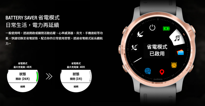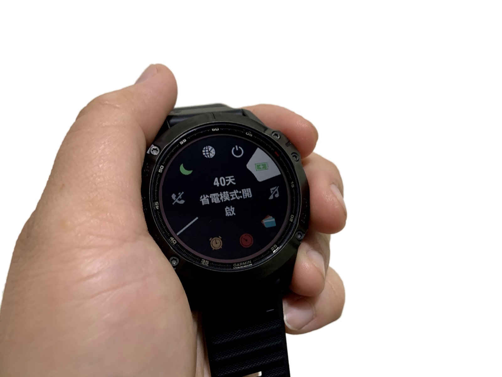 若搭配 Garmin 電量管理系統,更是能讓使用者在電力續航力的方面得到相當有感的體驗狀態。或者是長按左上角的 Light 鍵選到電池的圖示上,直接開啟省電模式就可以達到 80 天的超強續航!