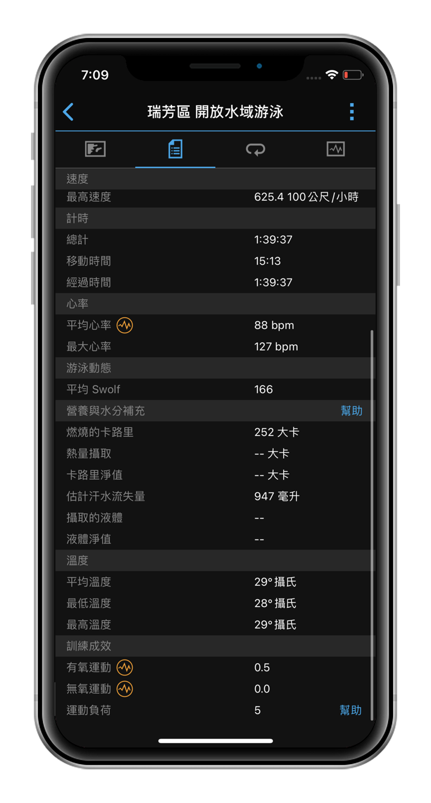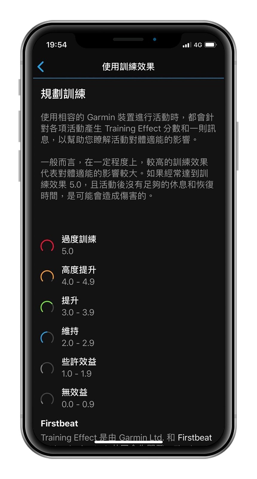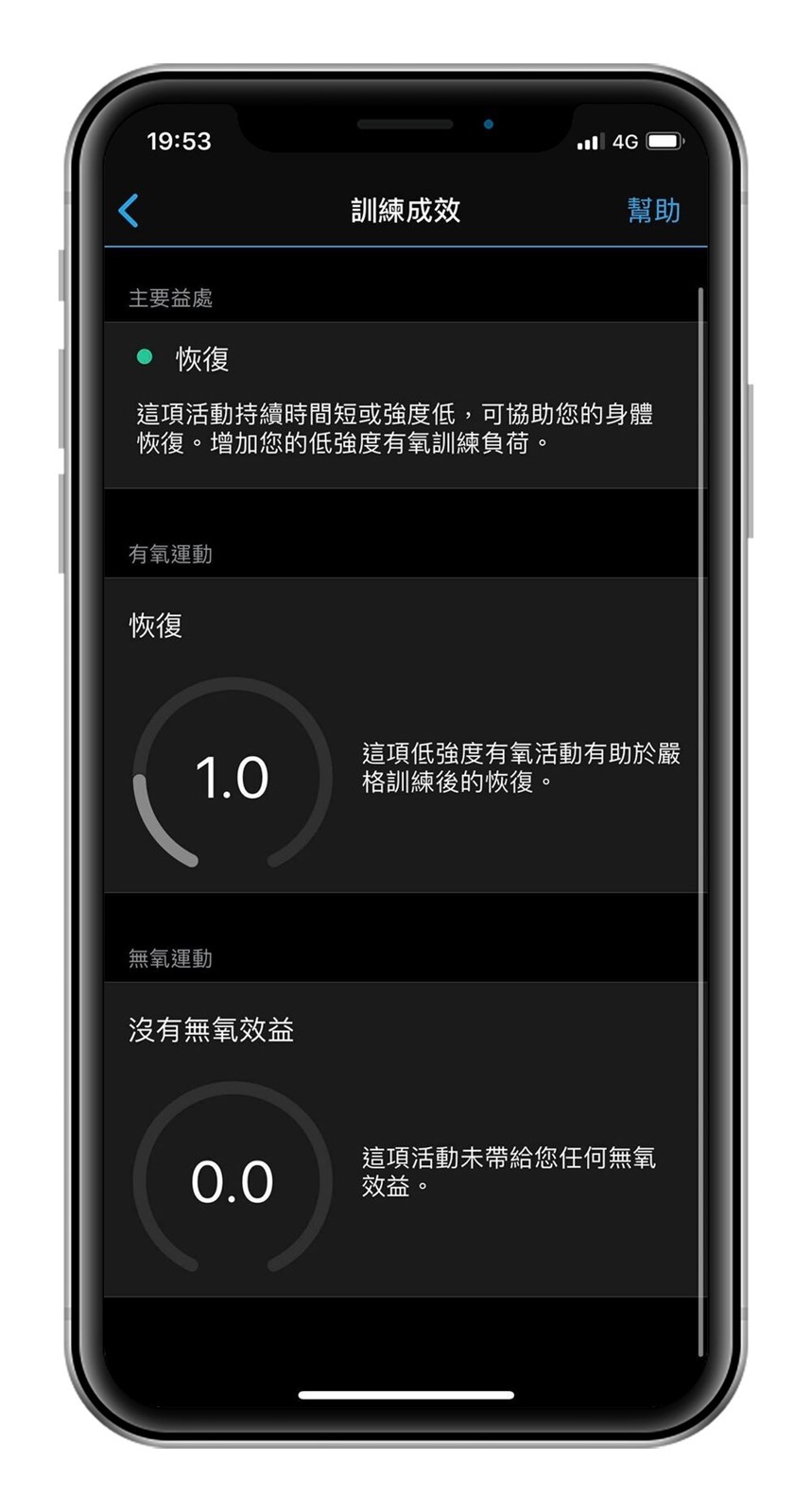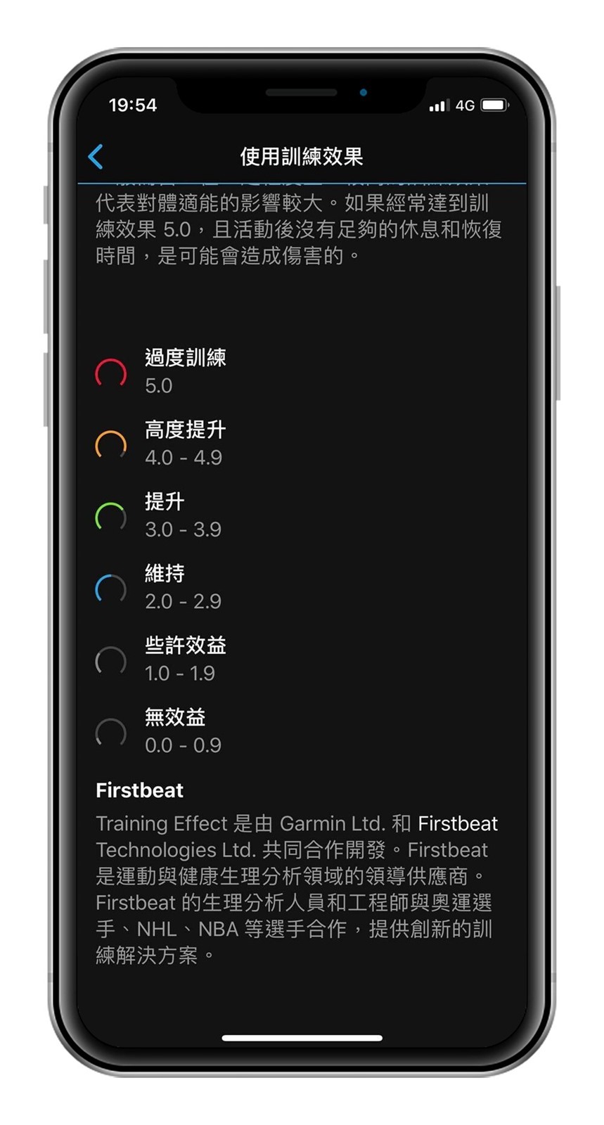 運動過程中的有氧運動、無氧運動變化也都會提供判斷的訓練成效給你參考。從 0-5 進行測量分數,0-0.9 的指數是屬在無效益狀態,往上到 5.0 則是過度訓練,訓練完後也可以參考這個使用訓練效果的量表做參考。