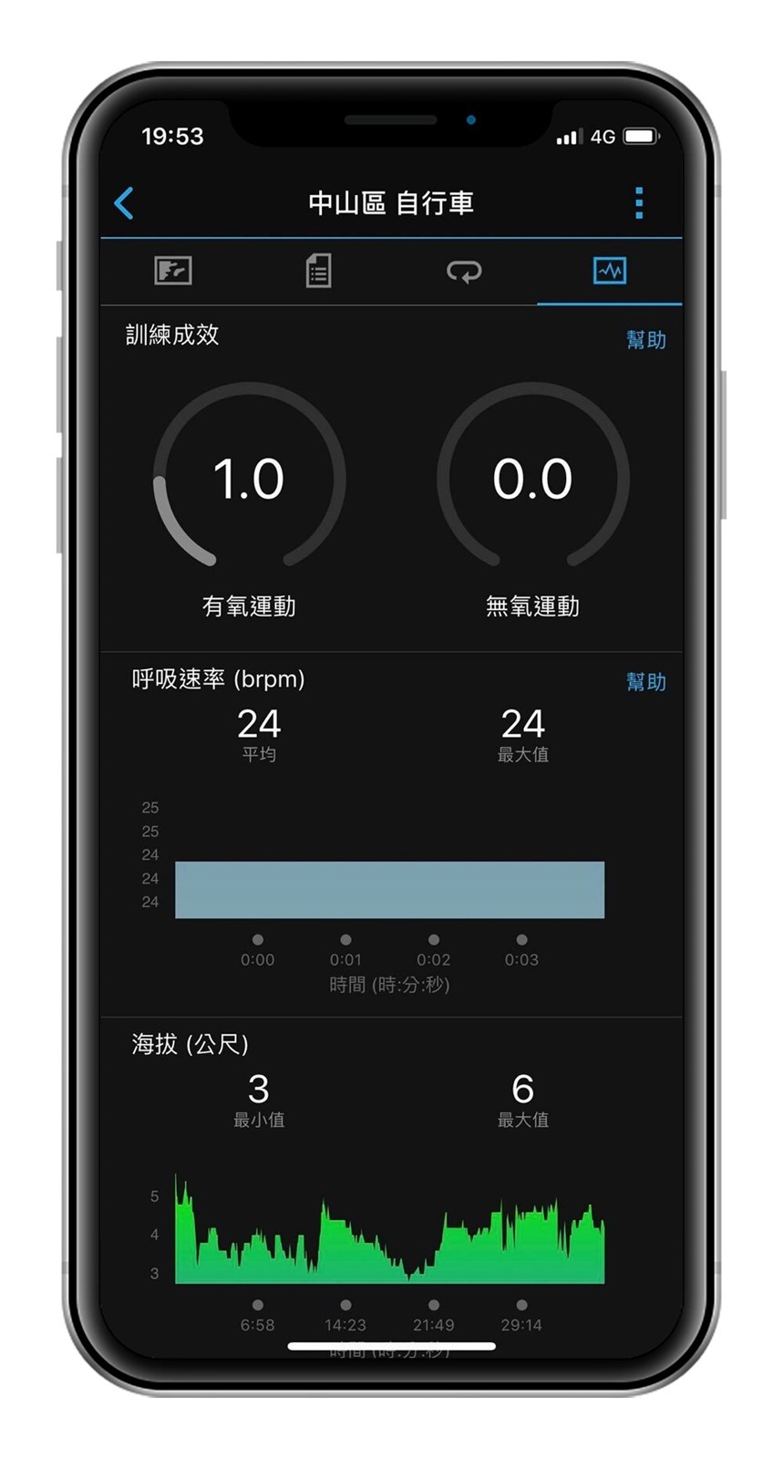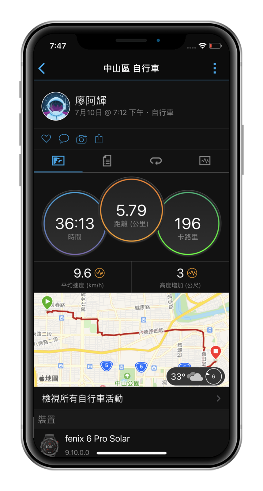 使用手錶實地紀錄過自己進行的活動後,可以再使用 Garmin Connect 的 app 查看更多的活動細節。