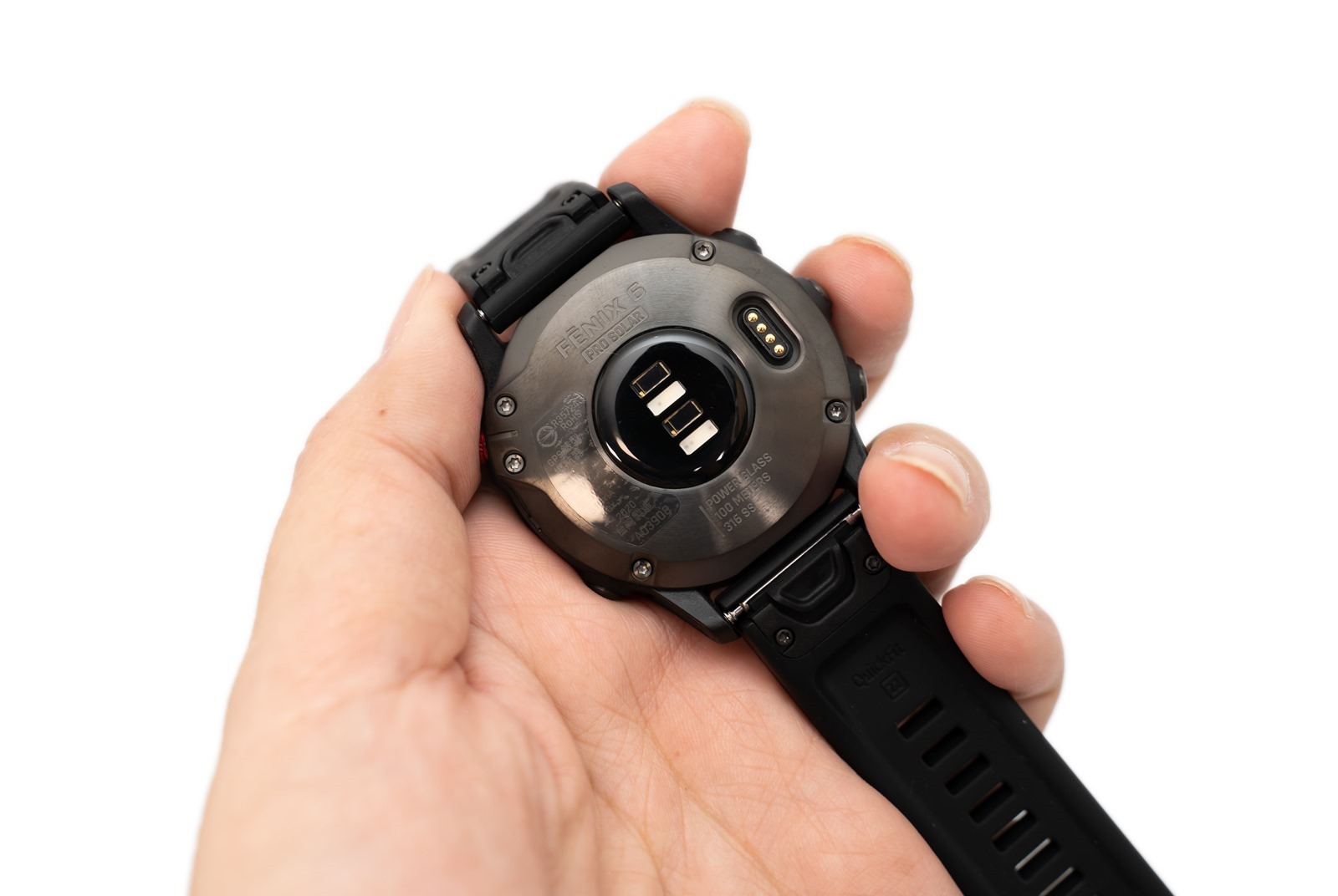 錶身的背面上方則印有『FENIX 6 PRO SOLAR』的型號字樣,下方則是印有 POWER GLASS 、 100METER 防水深度和 316SS 白鋼材質的說明字。錶背中央的部份則是腕式心率和血氧的感測器,亮綠光時是偵測心率、亮紅光時則是偵測血氧;右側是充電孔,使用專屬的 USB 充電線,連接行動電源也可充電。