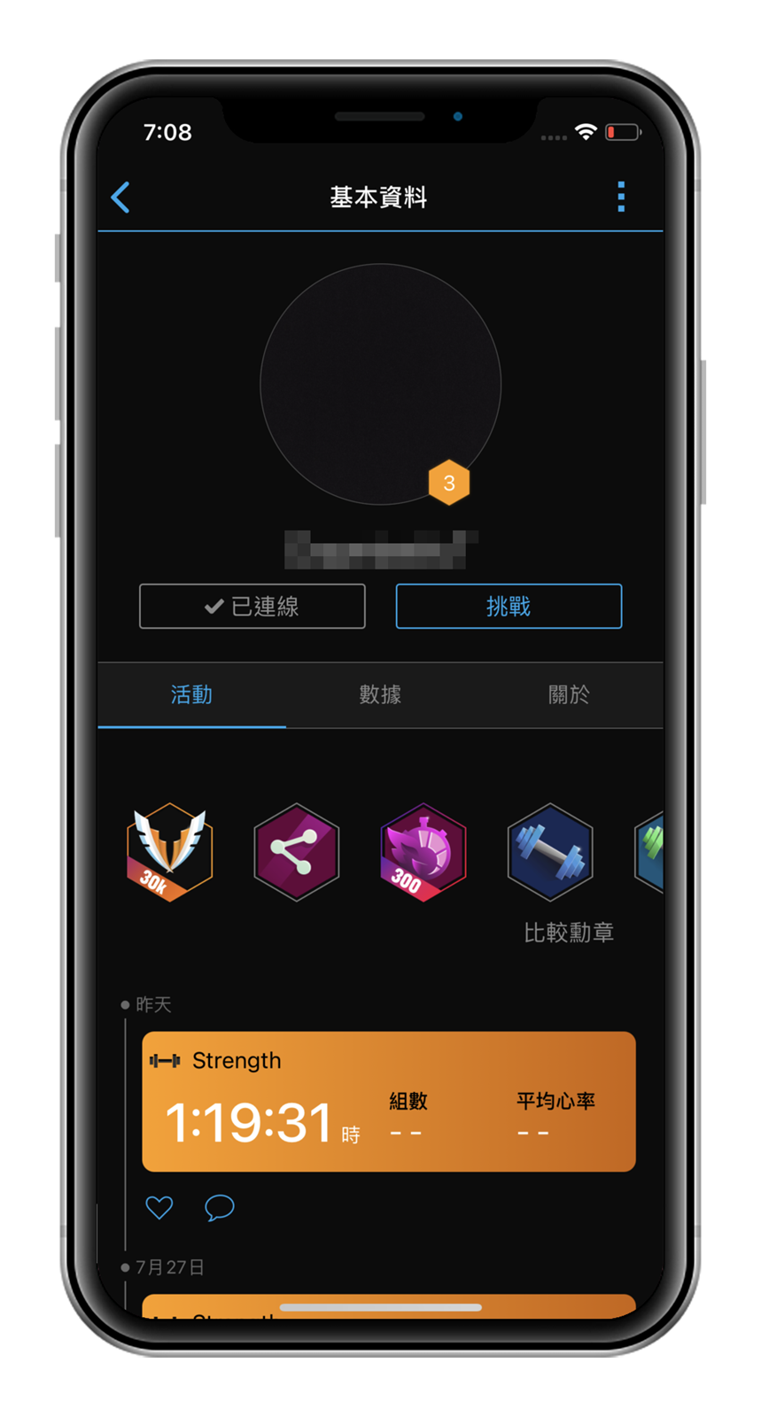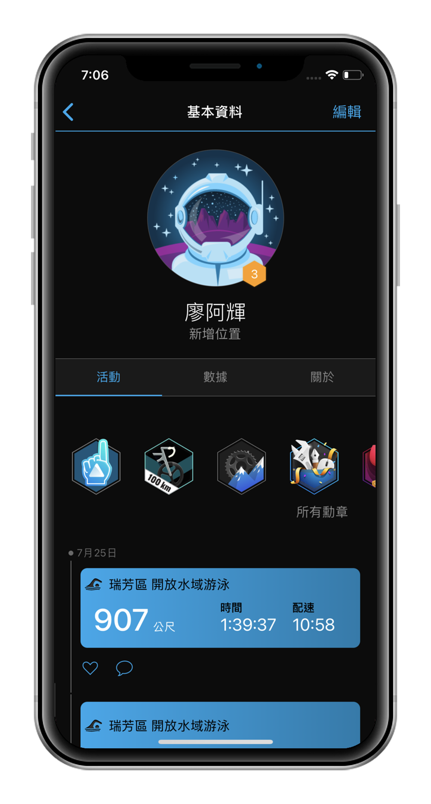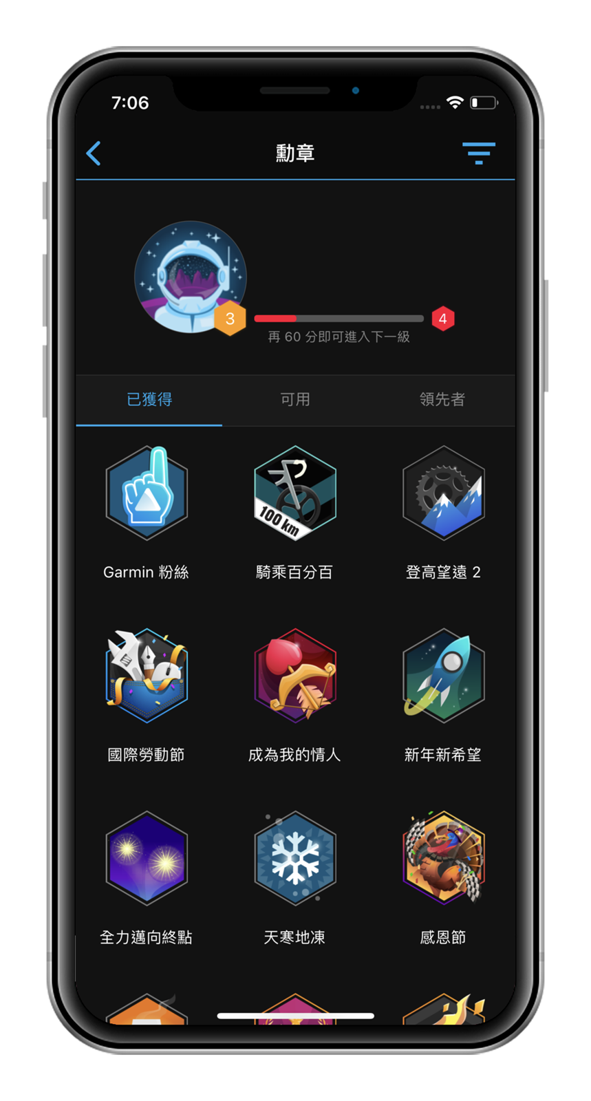 頁面上除了會顯示近期的個人活動紀錄以外,還能看到 Garmin 的最近取得成就勳章,喜歡收集徽章的阿輝也對這個功能感到非常有趣,希望這樣的偏執可以帶著阿輝像去 MWC 搜集攤位徽章一樣的動力,持續運動取得更多不同的徽章!
