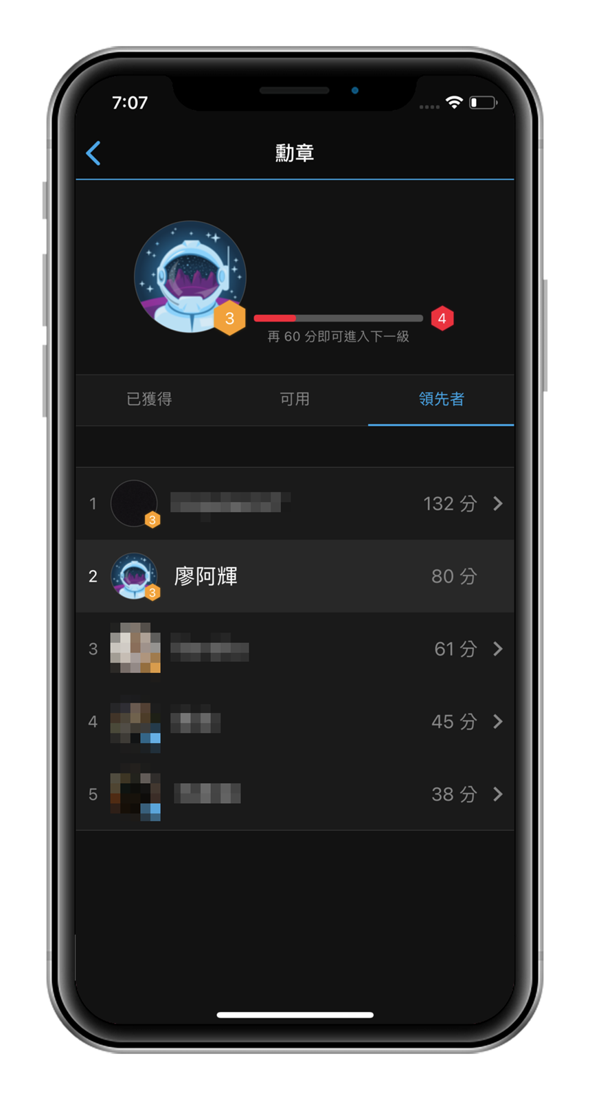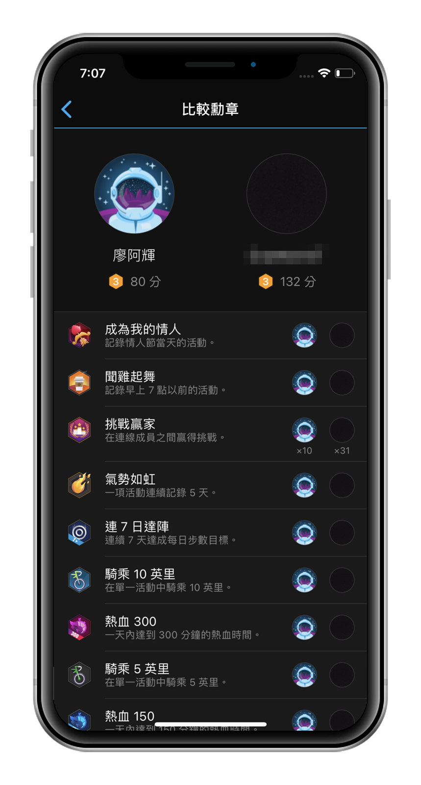每個徽章都有不同的積分,在 app 中也可以看到名單中的好友得到徽章的積分排名!也可以有個別與好友的徽章比較功能,可以查看取得過一樣的徽章或者自己沒有得到過的徽章,也有些人會以此為目標發現追尋更多手錶可以紀錄的運動功能。