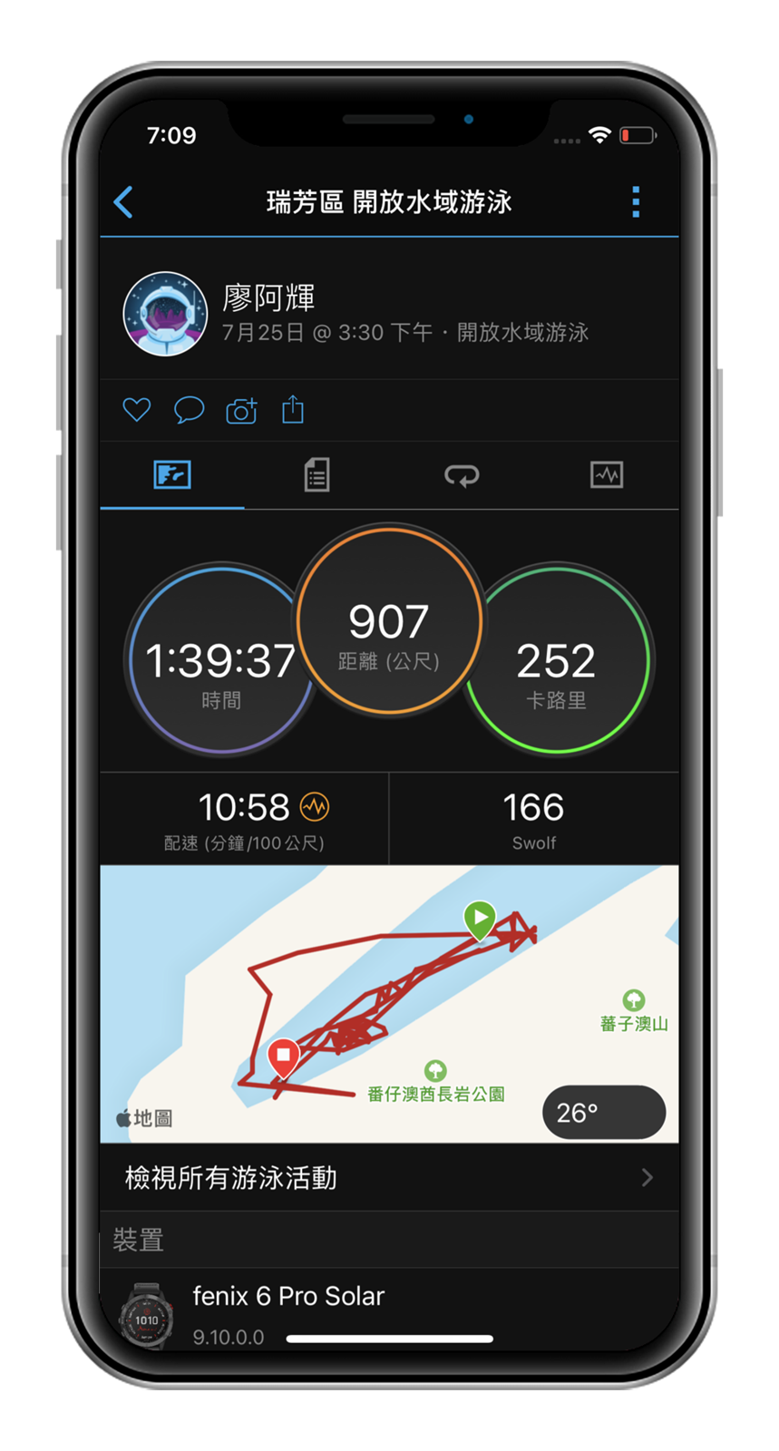 戶外游泳的紀錄也沒問題,Fenix 6 Solar 這一代的 GPS 定位體驗感受非常的好,相當即時以及準確度表現也不錯,阿輝也實測在酋長岩附近的海域中做戶外游泳,Garmin Connect 的資訊中可以看到阿輝游行的距離和配速狀況。