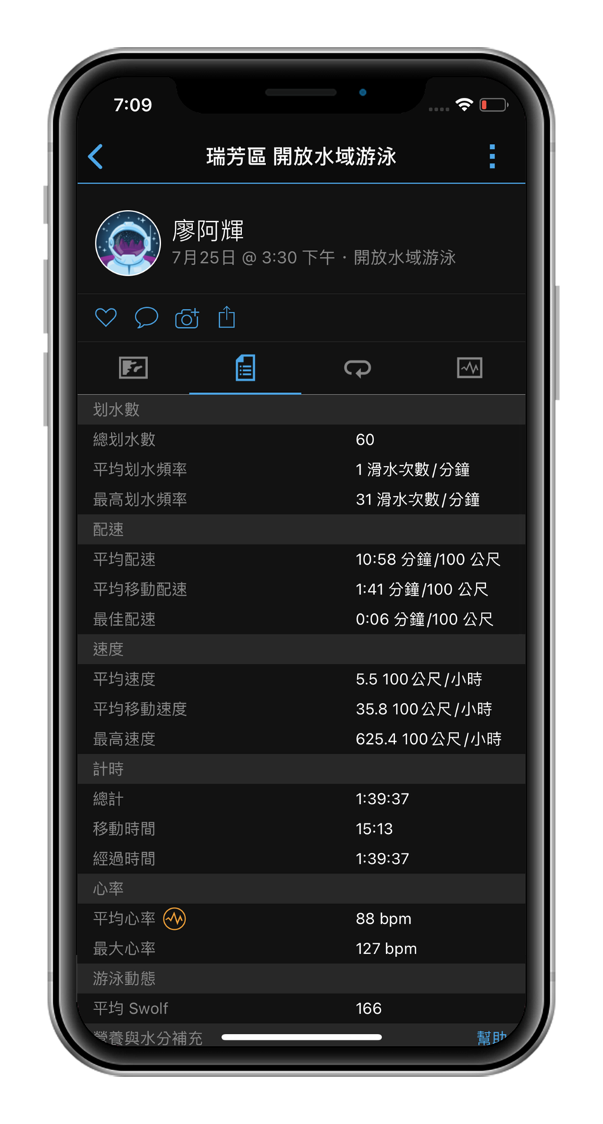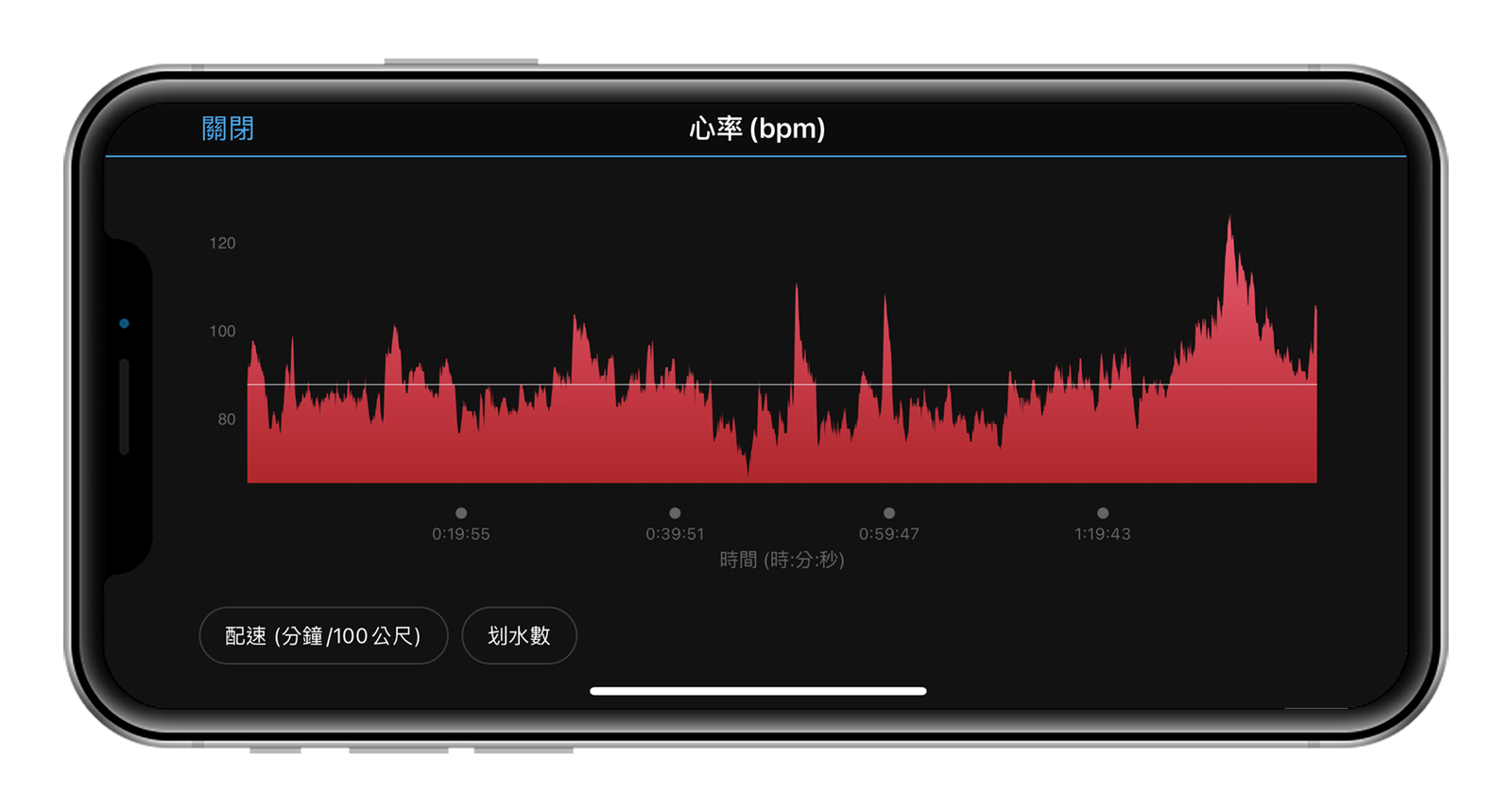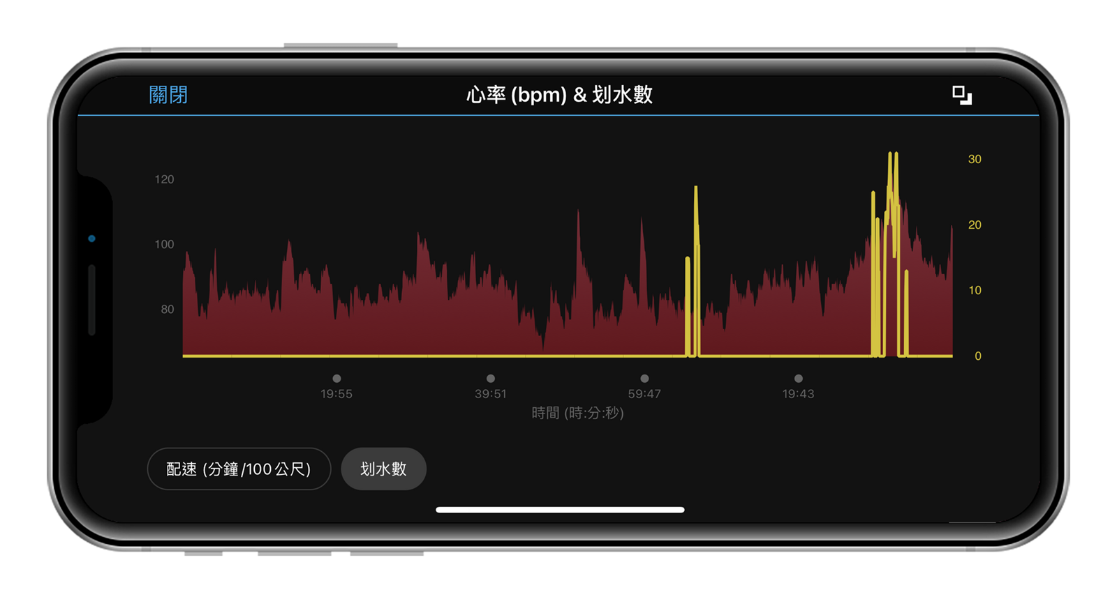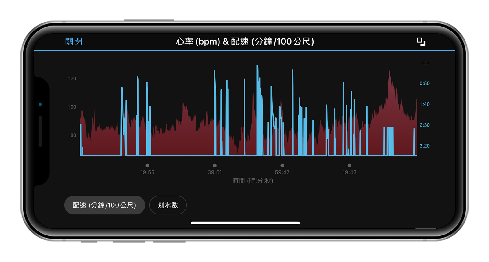Garmin Fenix 6 Pro Solar 不只支援一般使用情況的腕式心率偵測,同時也支援水下腕式心率監測,所以也能看到在水中游泳時的心率變化,再點進去圖資的下一層後也有配速狀況、划水數與心率的對照圖,可以進一步了解自己在運動時的心率狀態。