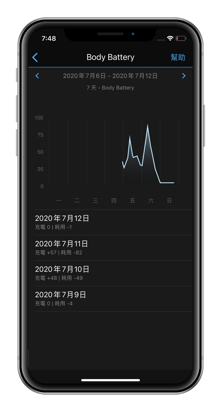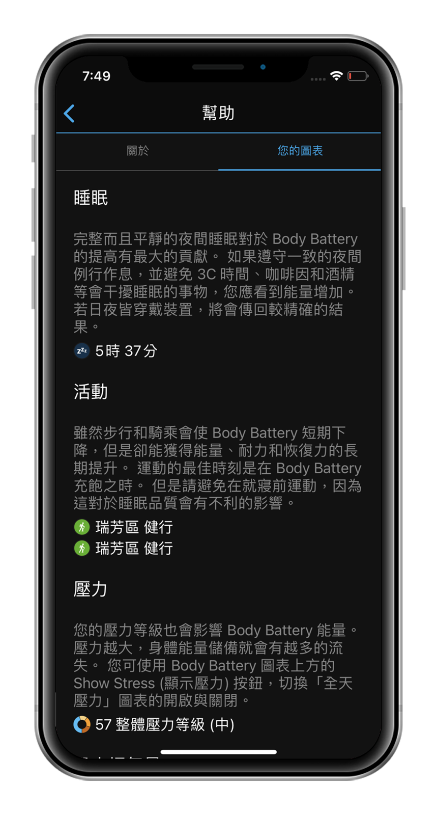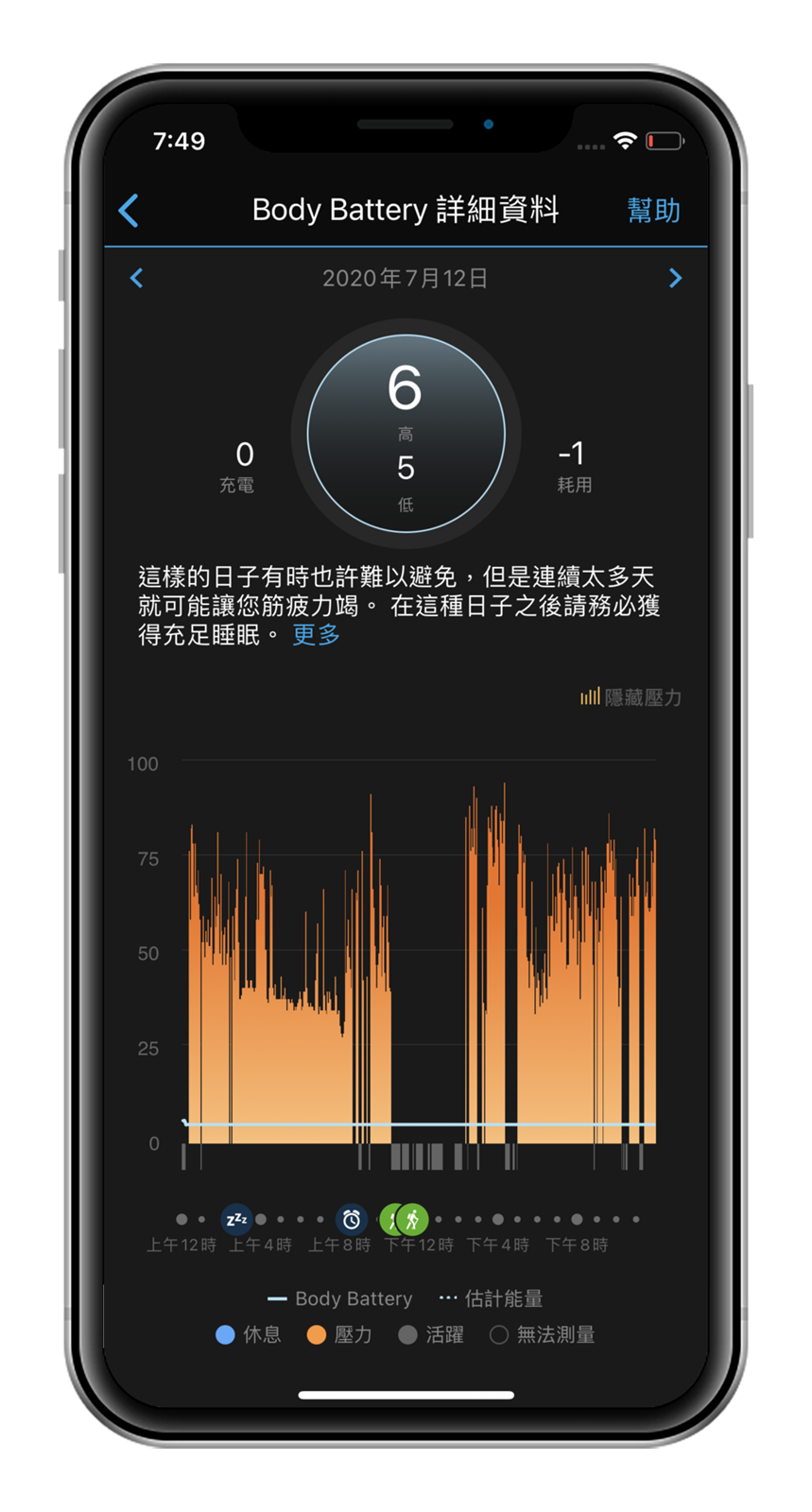 點擊某一日的日期後,可以進到 Garmin Body Battery 詳細資料裡,內容會有更詳細的身體使用各項活動的概要紀錄,例如睡眠時間長度、從事了什麼運動、最大攝氧量,身體的壓力等級與分析說明,提醒你調整分配活動與休息建議,不要忘記幫自己的活力再充電。