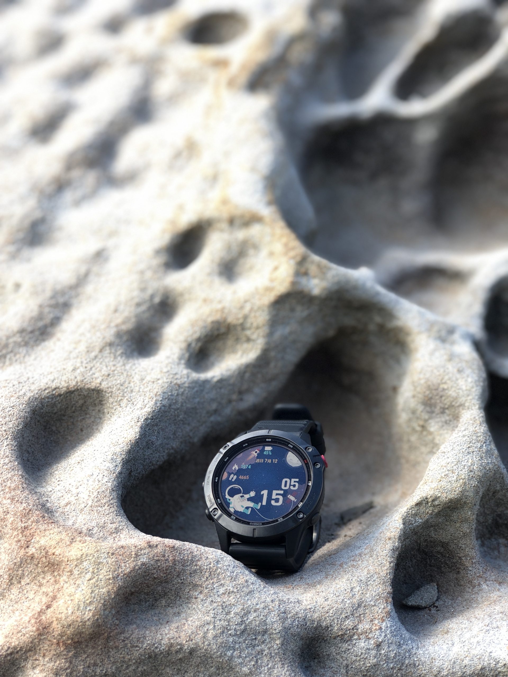 阿輝體驗的 Fenix 6 Pro Solar 看似和以往錶款在外觀上並沒有太大的差異,這看似沒有什麼不同的錶面,其實是做到了將太陽能板透明化的技術,因為一般來說太陽能板其實是偏黑色的,傳統上還會有許多吸收光的角度的問題需要克服才能達到良好的電力轉換率,Garmin 卻能將它做成透明化的裝置卻還是能順利的接收光能轉換成電力,可以說是非常高技術的研究成果!更不用說搭載的 MIP 高階顯示螢幕,也解決了在陽光下反光看不見螢幕的情形。