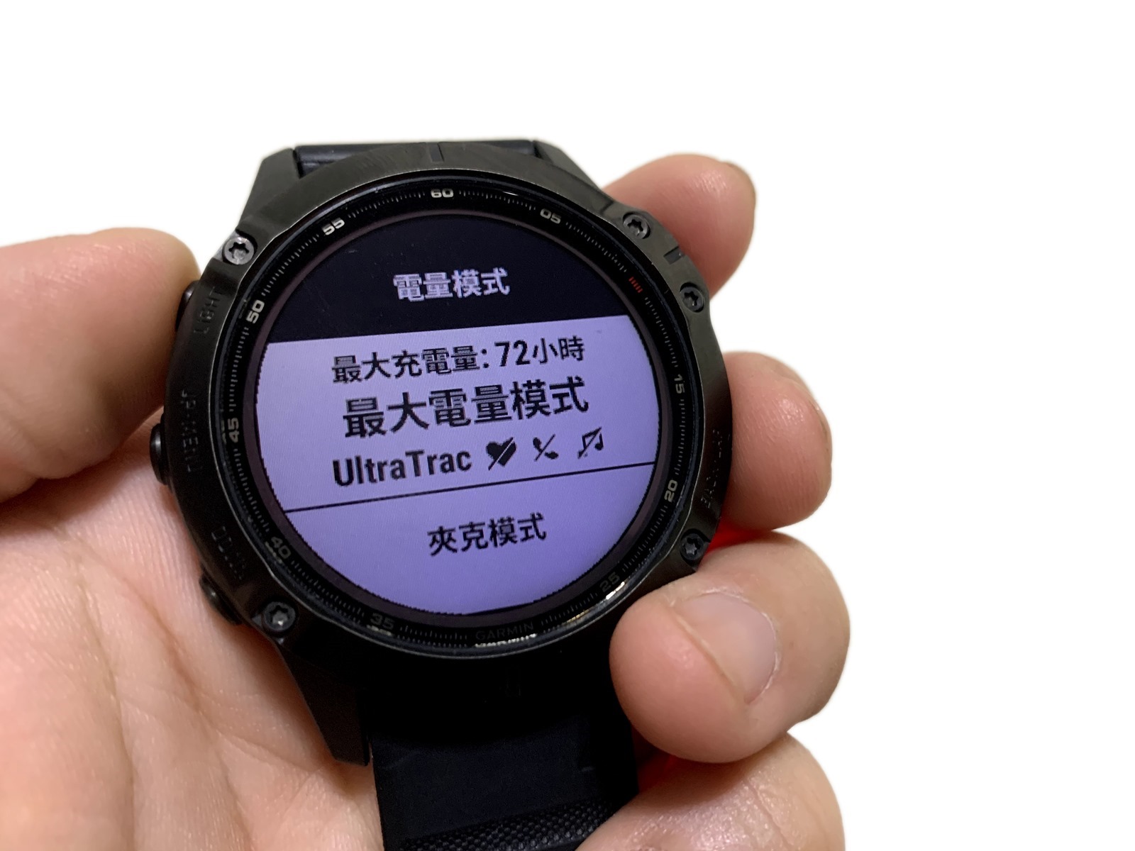 長按左邊中間按鈕進入選單後,到『電量管理』模式裡可以找到更多設置細節,電量模式內建的兩個選項是『最大電量模式』和『夾克模式』。最大電量模式若是要跑超馬或者那種超長距離的登山活動,建議可以開啟最大電量模式延長電池使用時間,GPS 會開啟 UltraTrac 紀錄一分鐘打點一次,腕式心率追蹤、手機連結和音樂功能都會關閉,最大的充電量可使用 93 小時;開啟夾克模式的話則是模擬手錶戴在外套外面的樣子,心率追蹤模式會關閉,但連接手機和音樂播放的功能可以持續使用。