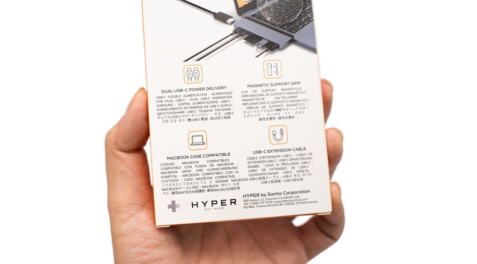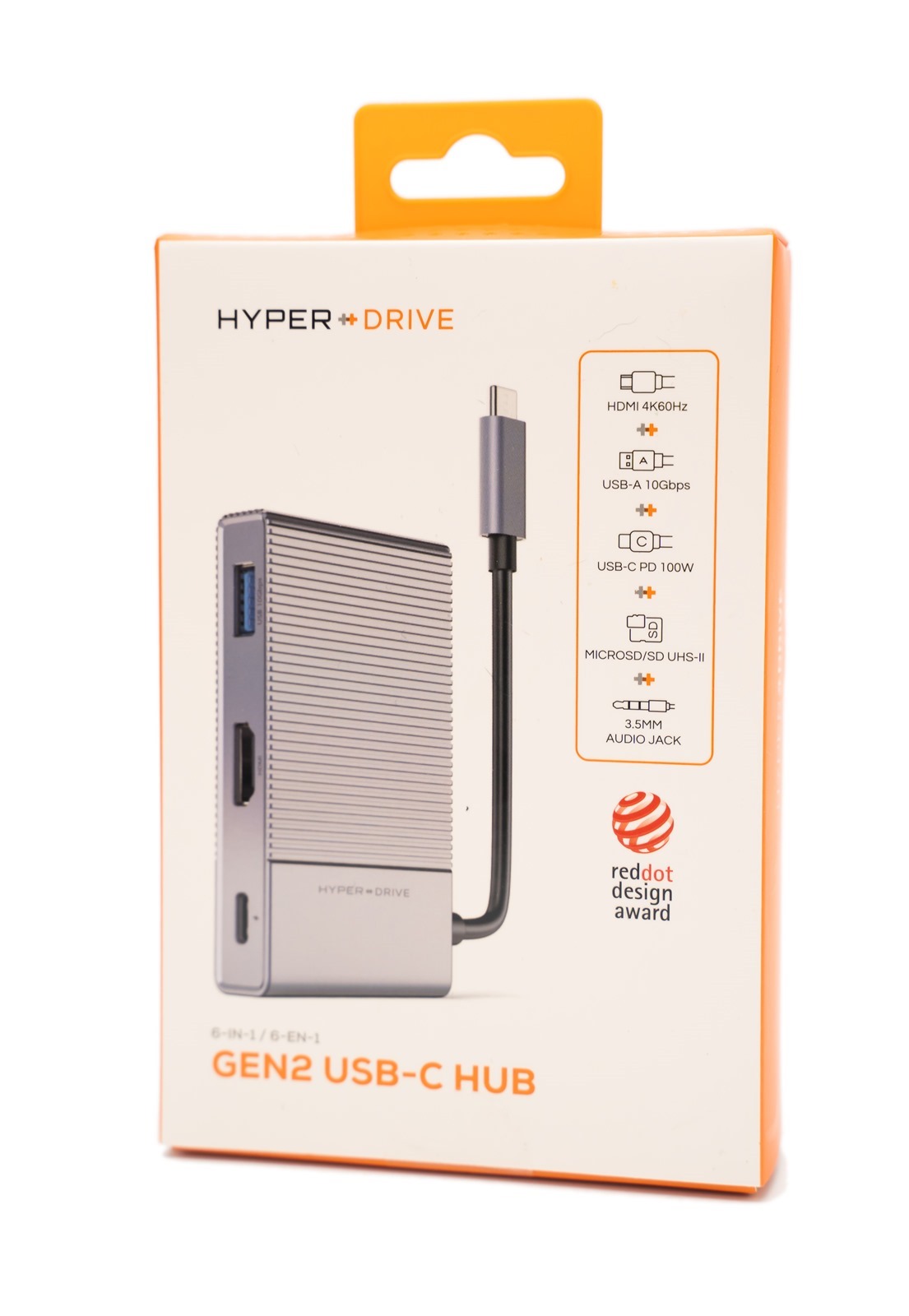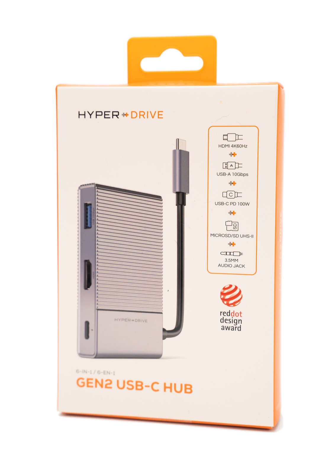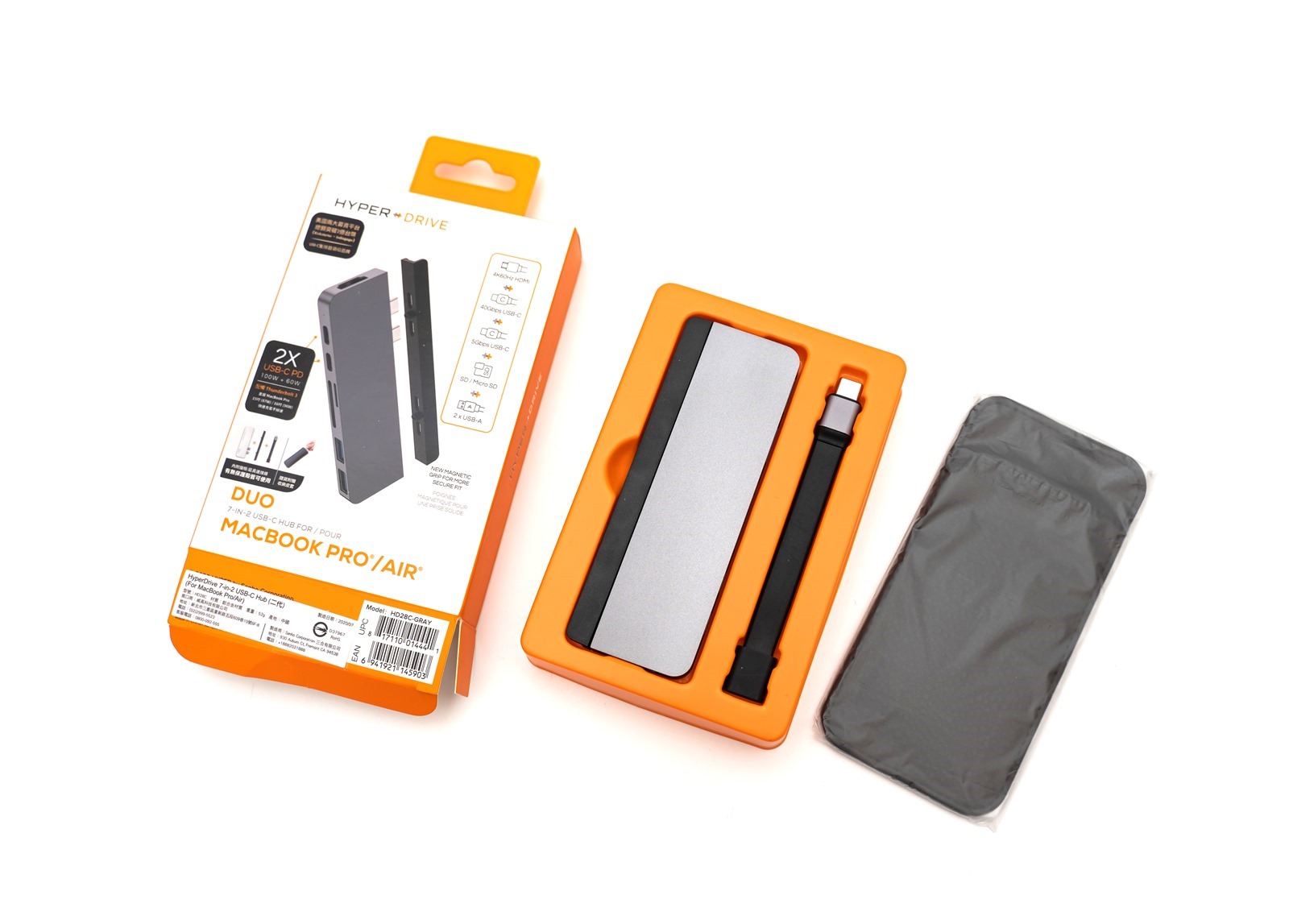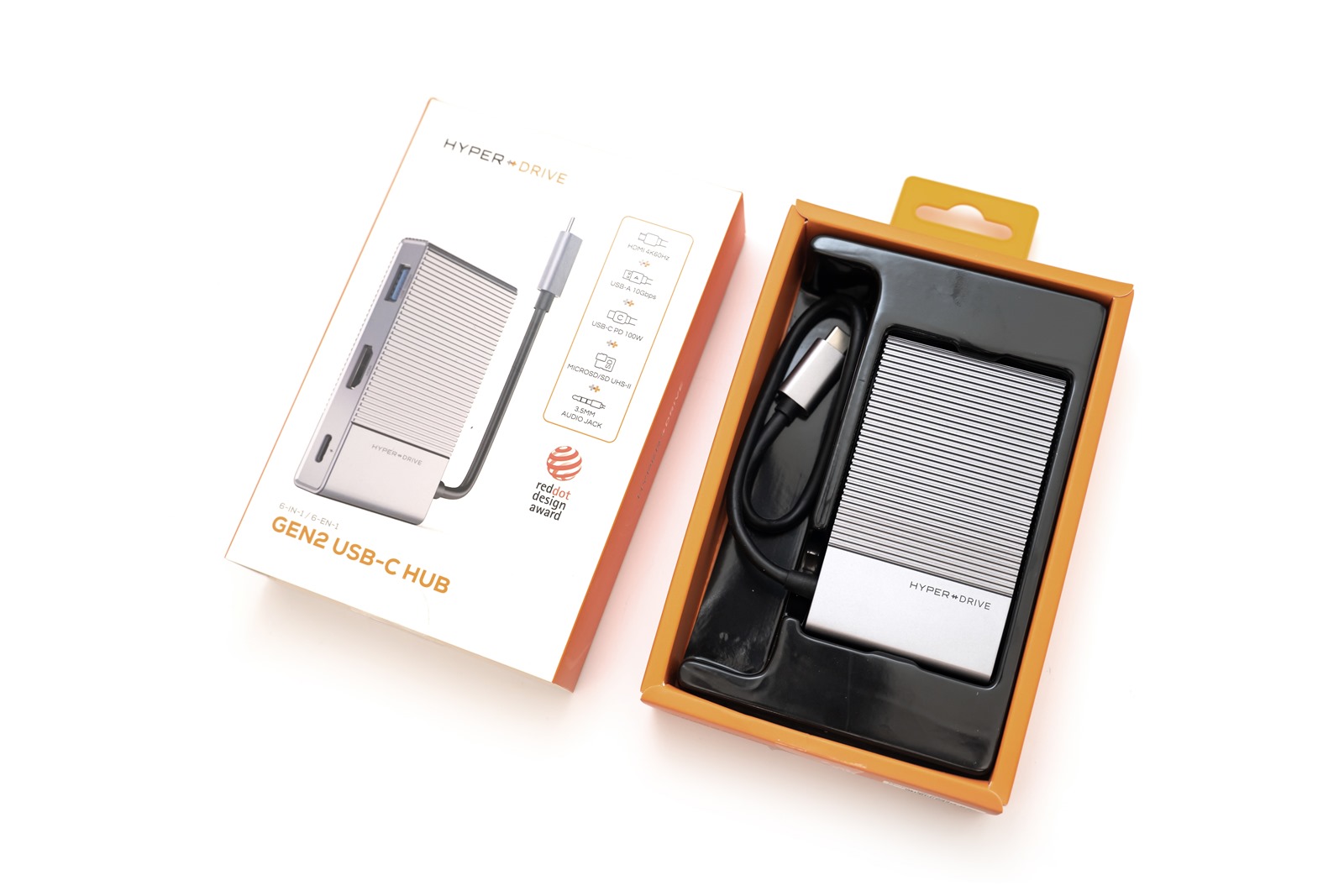 打開盒子之後,可以看到內容物被妥善安放在亮橘色、量身打造的盒子裡,可以一目了然地看清楚 7-in-2 USB-C Hub 二代的質感以及色澤,當然也能看到所有配件。