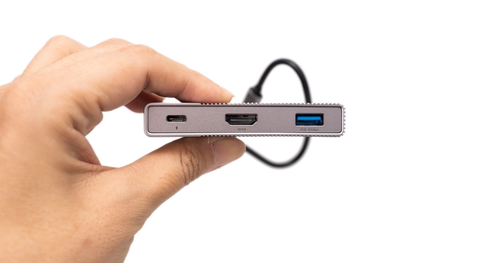 拿起來後,可以看到其中一端有著能提供 100W 穩定快充的 USB -C 充電連接埠(配合 PD 充電器),上面還繪製閃電圖案,讓人一眼便知那可以用來快速充電;旁邊則是升級後可以支援 4K@60Hz,讓畫面更流暢的 HDMI 4K 影像輸出埠,它能在工作簡報、會議投影或是居家娛樂看片時提供最佳效果。最後也是重點的 USB 3.1 Gen 2 的高速傳輸,最快可達 10Gb/s 的 USB-A 連接埠,傳送 1G 檔案只要 3-6 秒!