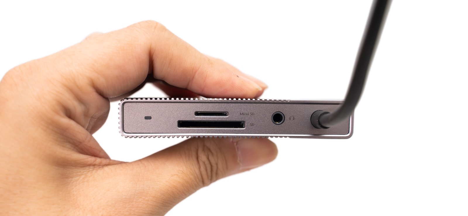 另一端是高速 SD/MircoSD 雙卡插槽,並且雙卡都支援讀取 UHS-II 300Mb/s 超高速傳輸,差不多跟夏亞的薩克一樣有三倍速的提升(真阿宅的形容)。然後旁邊是 3.5mm 音訊耳機插孔,隨插即用,可以直接享受高品質的音樂饗宴,即便是像 iPad Pro 以上沒有音源插孔的設備也可以透過 HyperDrive Gen2 USB-C Hub 來同時充電、讀取跟享受音樂;最旁邊則是工作指示燈。