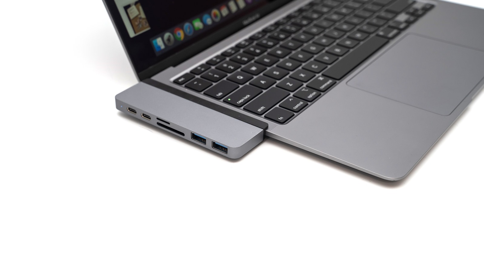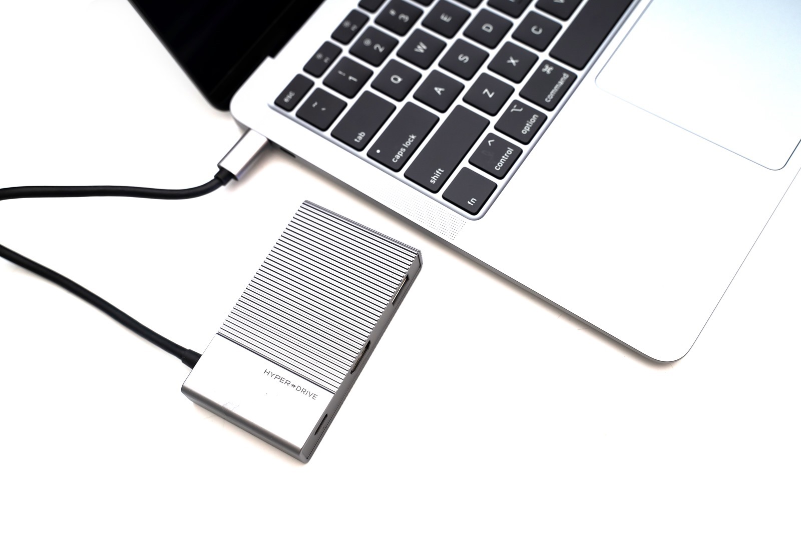 連接到筆電上也相當好看,與整體銀灰色配成套,彷彿原廠配件般有系列感,條紋的設計讓 HyperDrive Gen2 USB-C Hub 看起來專業俐落之外,多了一分俏皮與層次感。