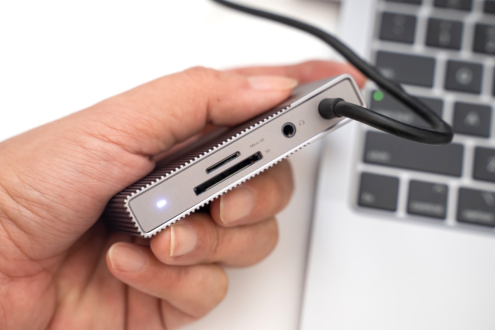 直接把 Hyper Drive 拿起來後,更可以看到本體的金屬科技感,跟上一代一樣,拿起來手感很好而且相當輕盈。就算是每天都跟 MacBook Pro 一起攜帶,也不會增加包包負重或是肩頸負擔。