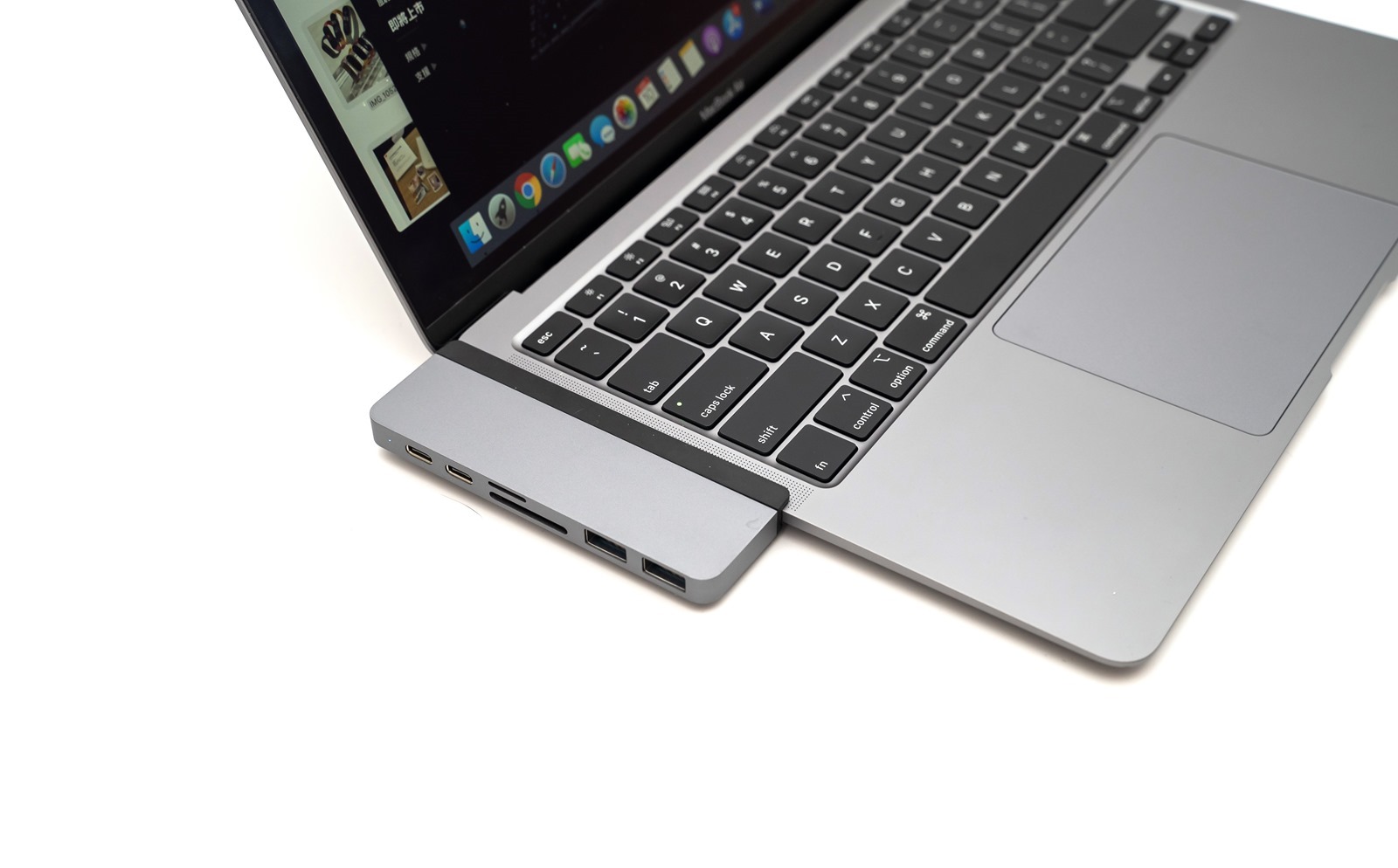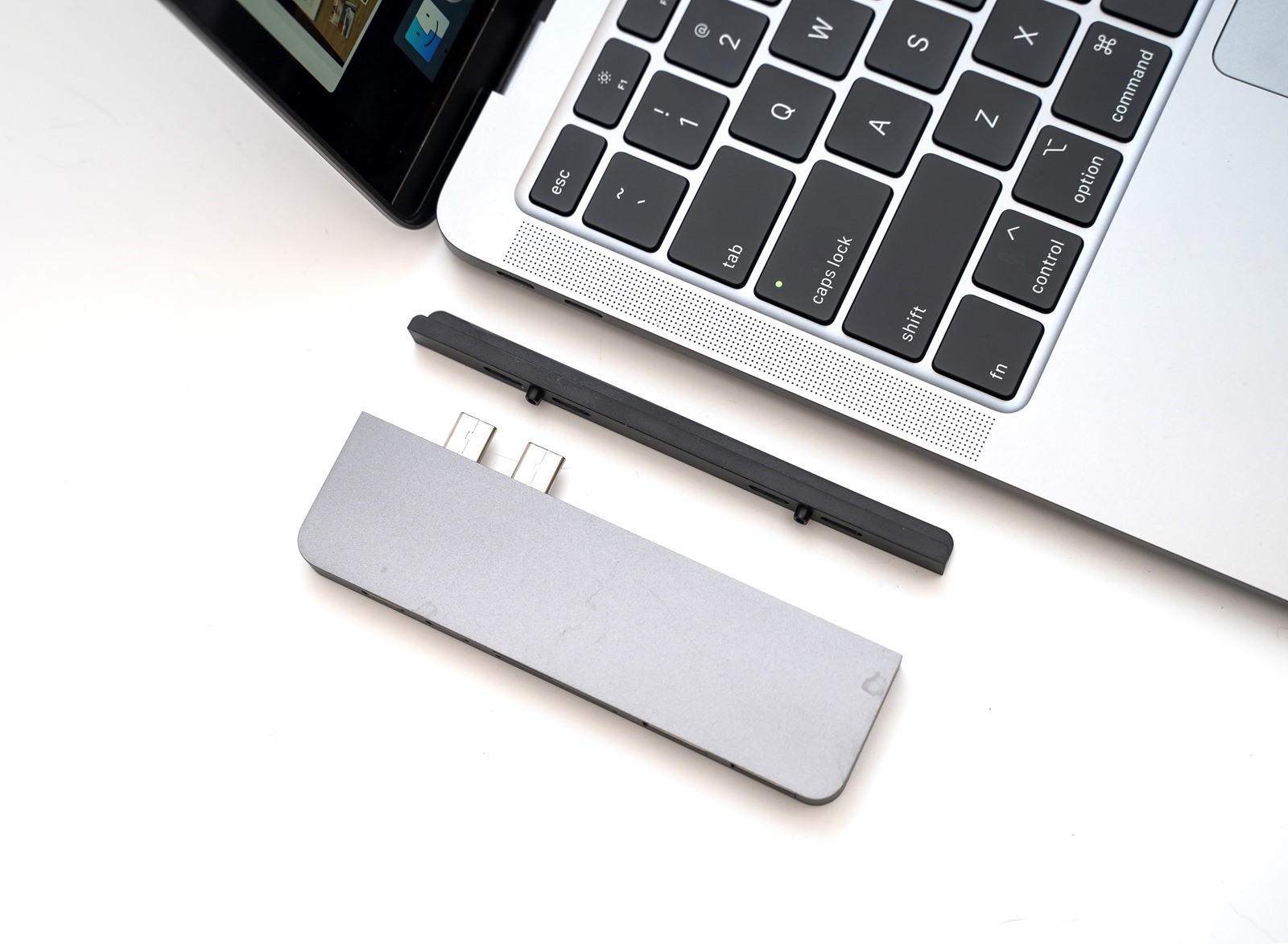 而對於裸機使用的朋友,就可以加上磁吸式檔板,調整長度後使用可以讓 HyperDrive 7-in-2 USB-C Hub 與電腦連接更穩固、無需擔心加長的 USB -C 接頭會晃動或折彎,影響使用體驗跟觀感。