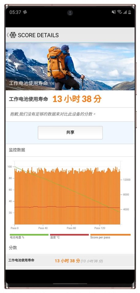 阿輝實際測試 Galaxy Note20 Ultra 5G 內建電池容量為 4500 mAh,實測電力部分以 PCMARK 做標準測試,測試 80% ~ 20% 間的電力運行,模擬上網、工作、遊戲的混合應用,測試結果為 13 小時 38 分鐘,測試方式與標準可以參考這篇說明。