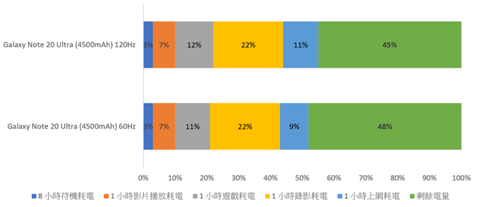 - 螢幕更新率影響電力較大,電力額外消耗了 19.2%,不過應該是因為 Galaxy Note20 Ultra 5G 新的可變螢幕技術,