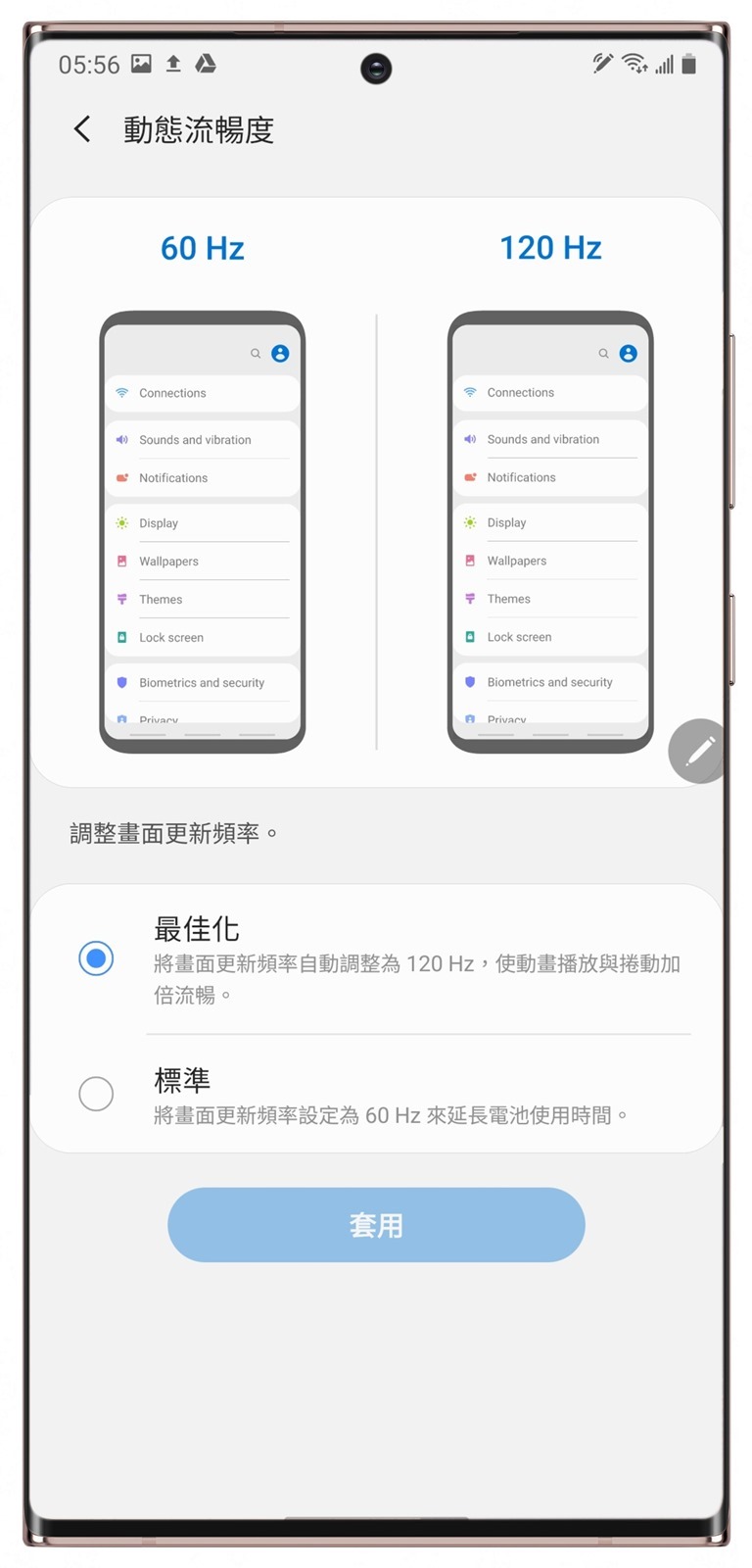 最佳化動態流暢度,一樣是最高更新率可達 120Hz,但螢幕會更進一步依照即時顯示內容的不同而調整顯示刷新率