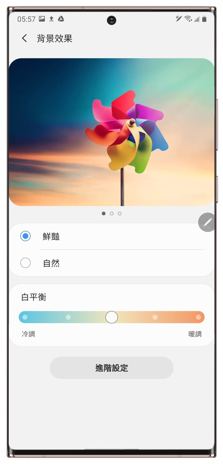 對於顏色要求更重視使用者,Galaxy Note 20 Ultra 5G 也可以自行調整螢幕色彩設定,鮮豔或是自然都可以自行選擇,也可以自訂白平衡色彩傾向,不喜歡內建的色彩?沒關係你可以自己調整!