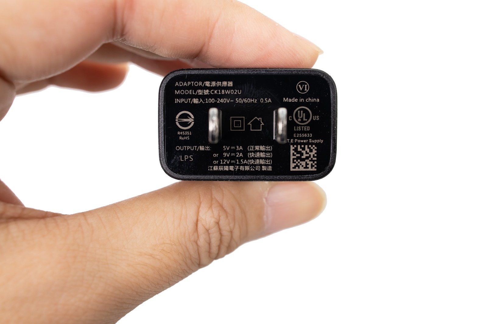 18W 快充充電器,支援 9V/2A 或是 12V/1.5A 輸出,採用 USB A 接口應該是走 QC 3.0 充電規格,另外這次充電器體積非常小巧十分方便攜帶,消費者不用另外購買也是一個貼心的地方。