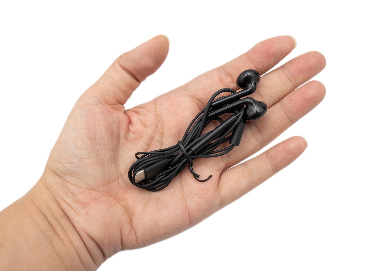 直接攤開給大家看所有內容物配件,盒中配件包含了 USB A to USB C 充電傳輸線、 18W 充電器,USB C 界面的有線耳機。