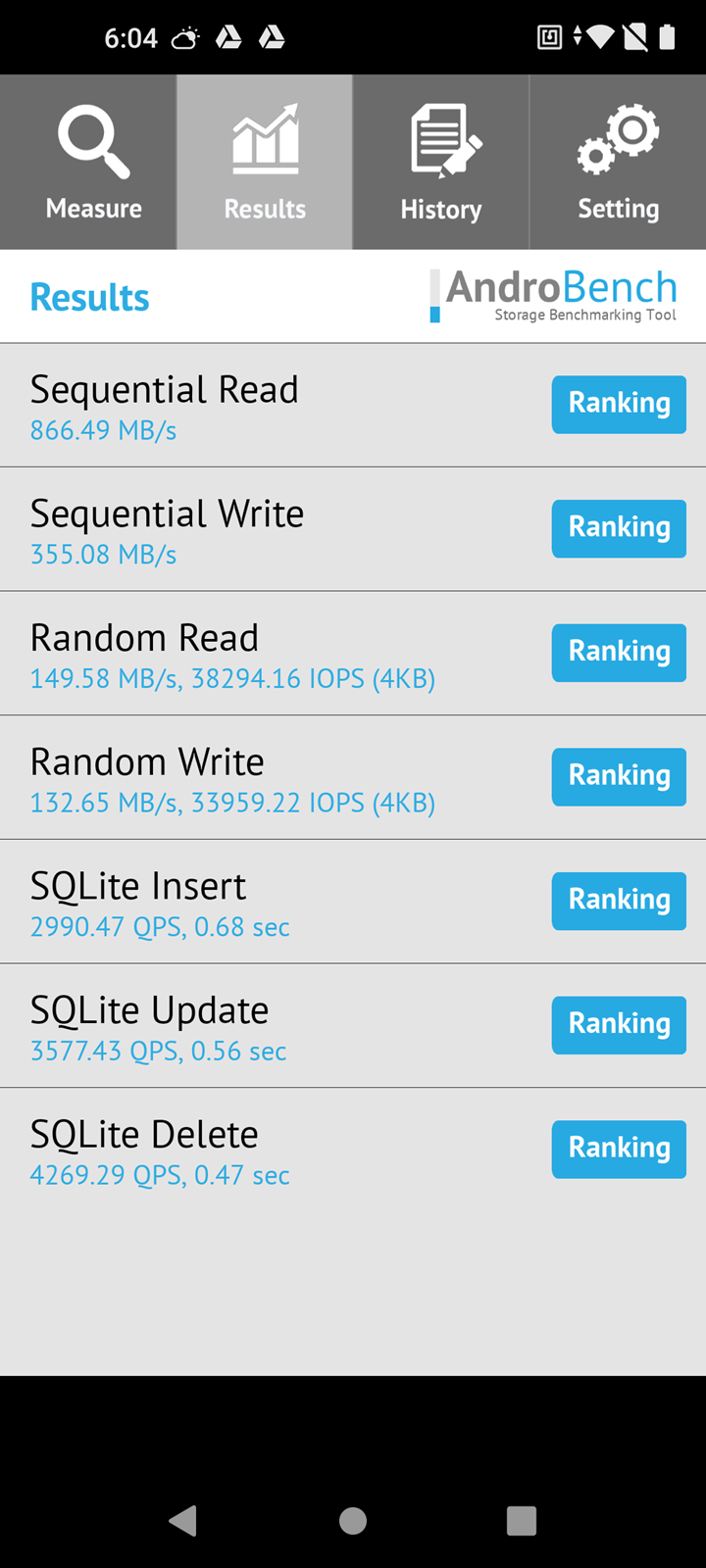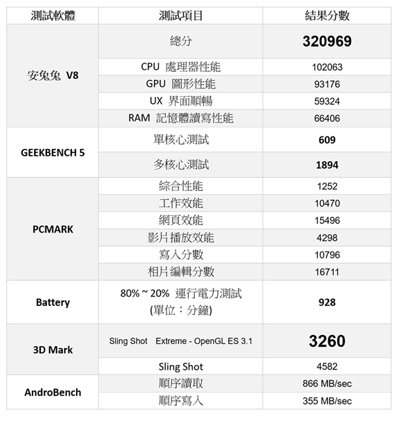 其實除了 CPU 處理器與記憶體,內建儲存空間的讀取/寫入速度也非常影響到日常使用的順暢度,這裡使用 AndroBench 實測讀寫速度,測得的結果為讀取 866 MB/sec MB,寫入為 355 MB/sec,表現中規中矩不算特別優異。