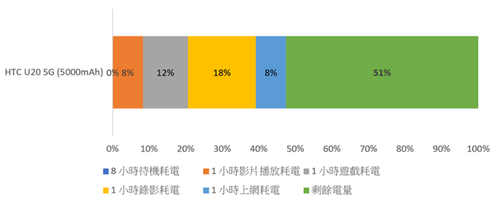 - HTC U20 5G 瀏覽器連續讀取瀏覽 1 小時,實際消耗 8% 電量,剩餘 51% 電量