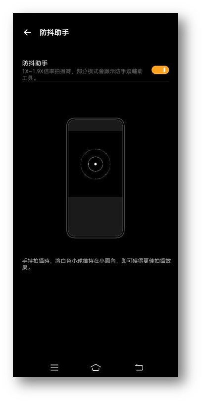 拍影片時微雲台技術也可以很有效的減少晃感,強烈建議可以在設定中開啟防守助手,畫面中會出現同心圓與小白球,在拍攝過程中盡可能讓小白球維持在圈圈的內圈中,就是可以得到最佳拍攝效果的狀態