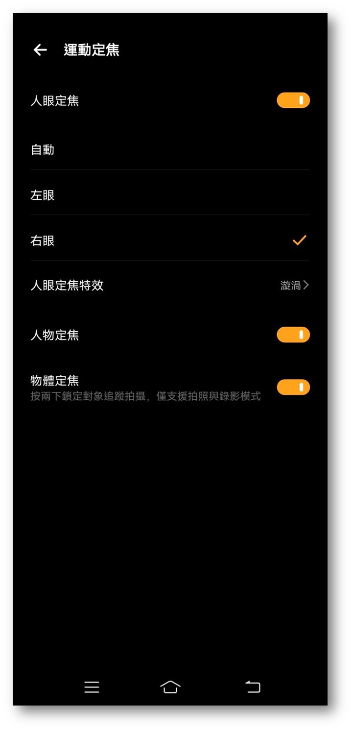 影片拍攝部份智能追焦則可以開啟人眼追焦甚至是左右眼優先的設定,追焦目標則是人物或是物體都可以支援。