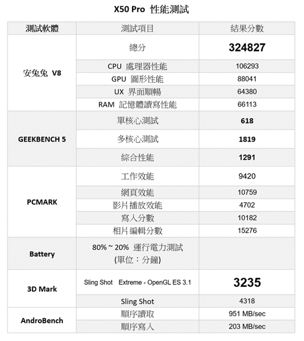 X50 Pro 採用目前高通中階 S7 系列最高等級的 765G 處理器,支援 5G 網路技術,性能大約為接近之前旗艦 S845 處理器的水準,內建記憶體則是搭配 8GB 內建記憶體的規格配置,更多資料也可以阿輝資料庫 https://reurl.cc/MxdjK ,資料庫中包含超過 350 支以上阿輝多年測試的實測數據,可以給大家作為對照參考使用。