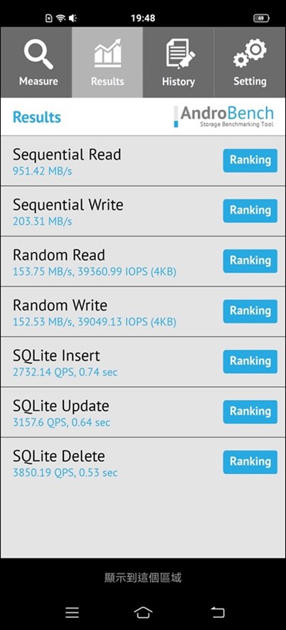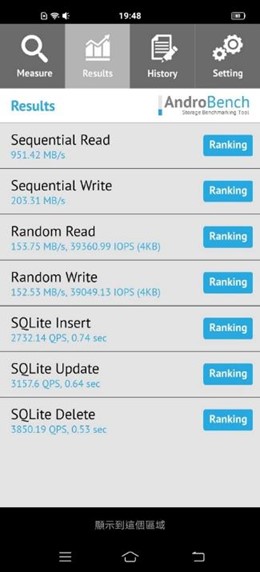 其實除了 CPU 處理器與記憶體,內建儲存空間的讀取/寫入速度也非常影響到日常使用的順暢度,這裡使用 AndroBench 實測讀寫速度,測得的結果為讀取 951 MB/sec MB,寫入為 203 MB/sec