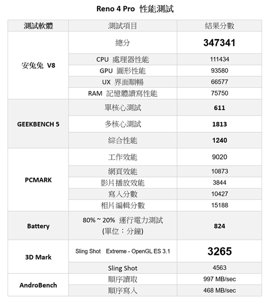 Reno4 Pro 採用目前高通中階 S7 系列最高等級的 S765G 處理器,支援 5G 網路技術,性能大約為接近之前旗艦 S845 處理器的水準,內建記憶體則是搭配 12GB 內建記憶體與內建 256GB 儲存空間的規格配置,更多資料也可以阿輝資料庫 https://reurl.cc/MxdjK ,資料庫中包含超過 350 支以上以上阿輝多年測試的實測數據,可以給大家作為對照參考使用。